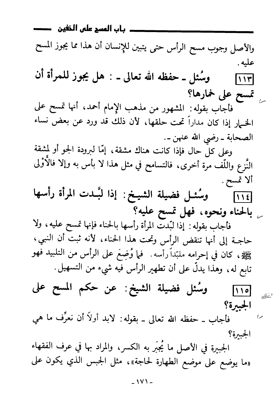 114) وسُئل فضيلة الشيخ: إذا لبَّت المرأة رأسها بالحناء ونحوه، فهل تمسح عليه؟