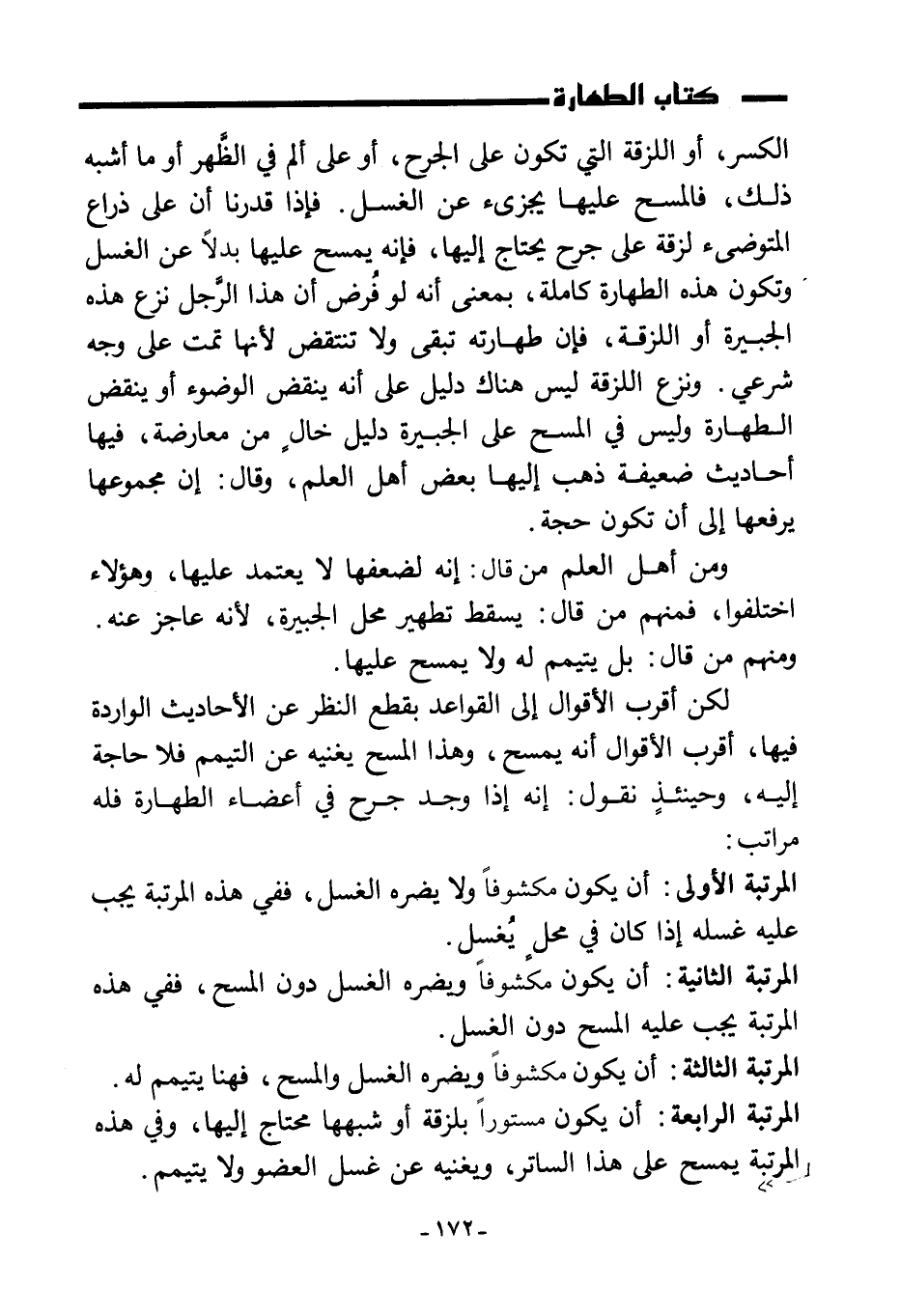 المرتبة الرابعة: أن يكون مستوراً بلزقة أو شبهها محتاج إليها، وفي هذه المرتبة يمسح على هذا الساتر، ويغنيه عن غسل العضو ولا يتيمم.