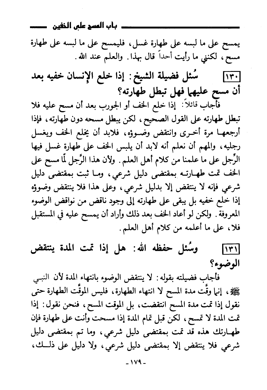 130) سُئل فضيلة الشيخ: إذا خلع الإنسان خفيه بعد أن مسح عليهما فهل تبطل طهارته؟