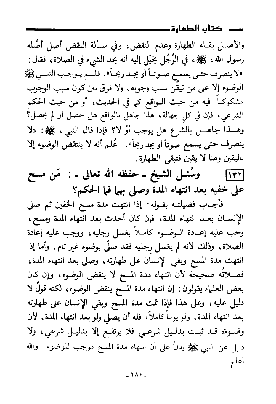 132) وسُئل الشيخ - حفظه الله تعالى: مَن مسح على خفيه بعد انتهاء المدة وصلى بهما فما الحكم؟