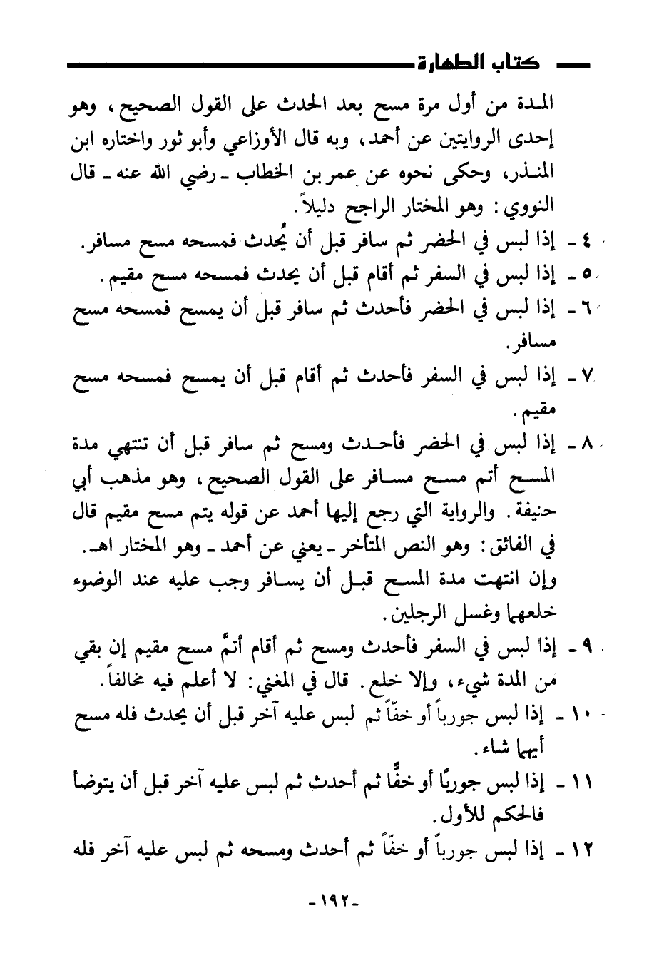 7- إذا لبس في السفر فأحدث ثم أقام قبل أن يمسح فمسحه مسح مقيم.