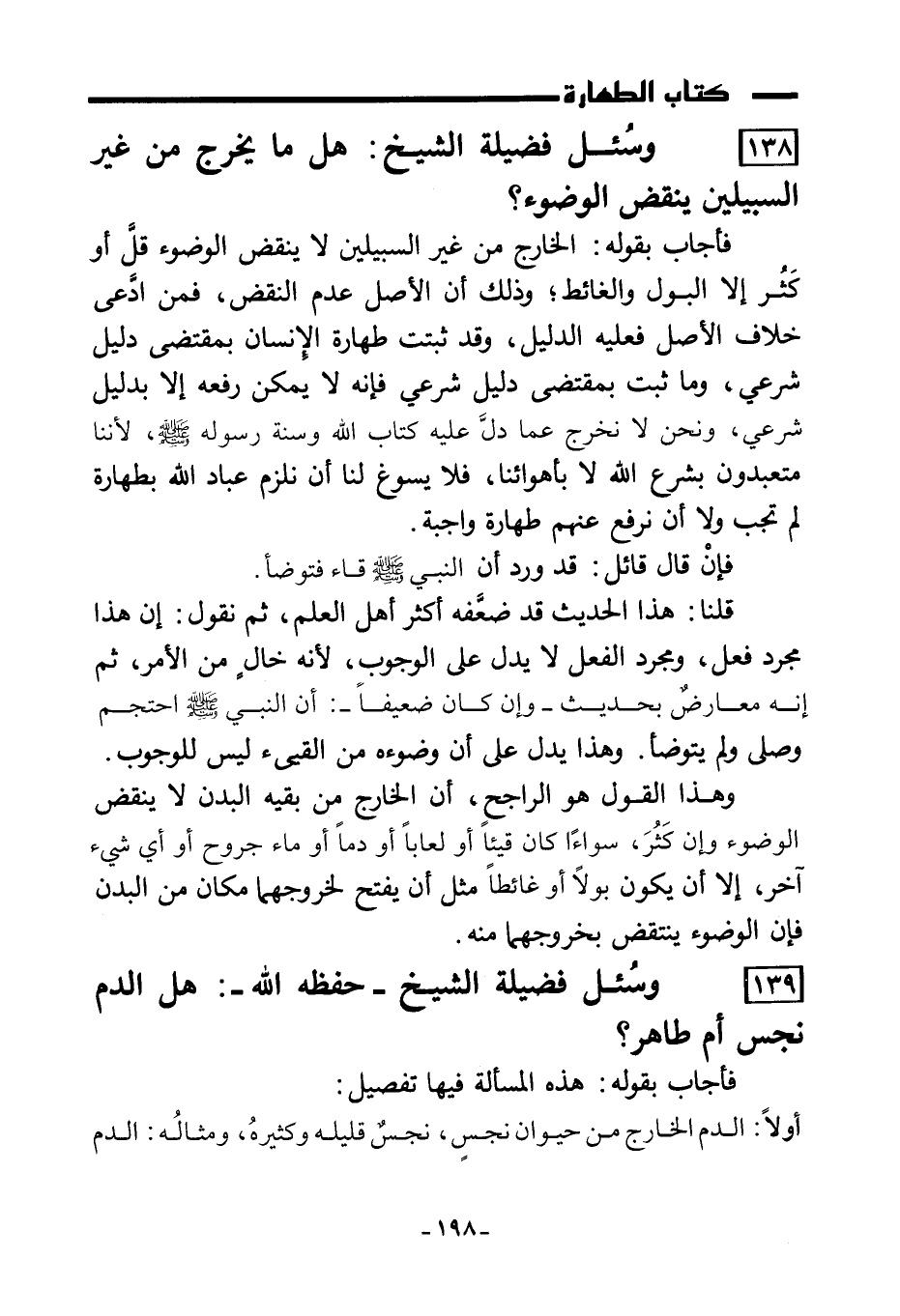 138) وسُئل فضيلة الشيخ: هل ما يخرج من غير السبيلين ينقض الوضوء؟