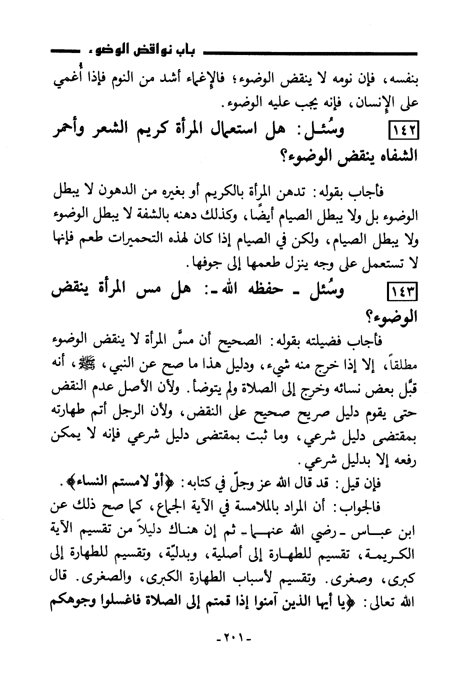 143) وسُئل ـ حفظه الله ـ: هل مس المرأة ينقض الوضوء؟