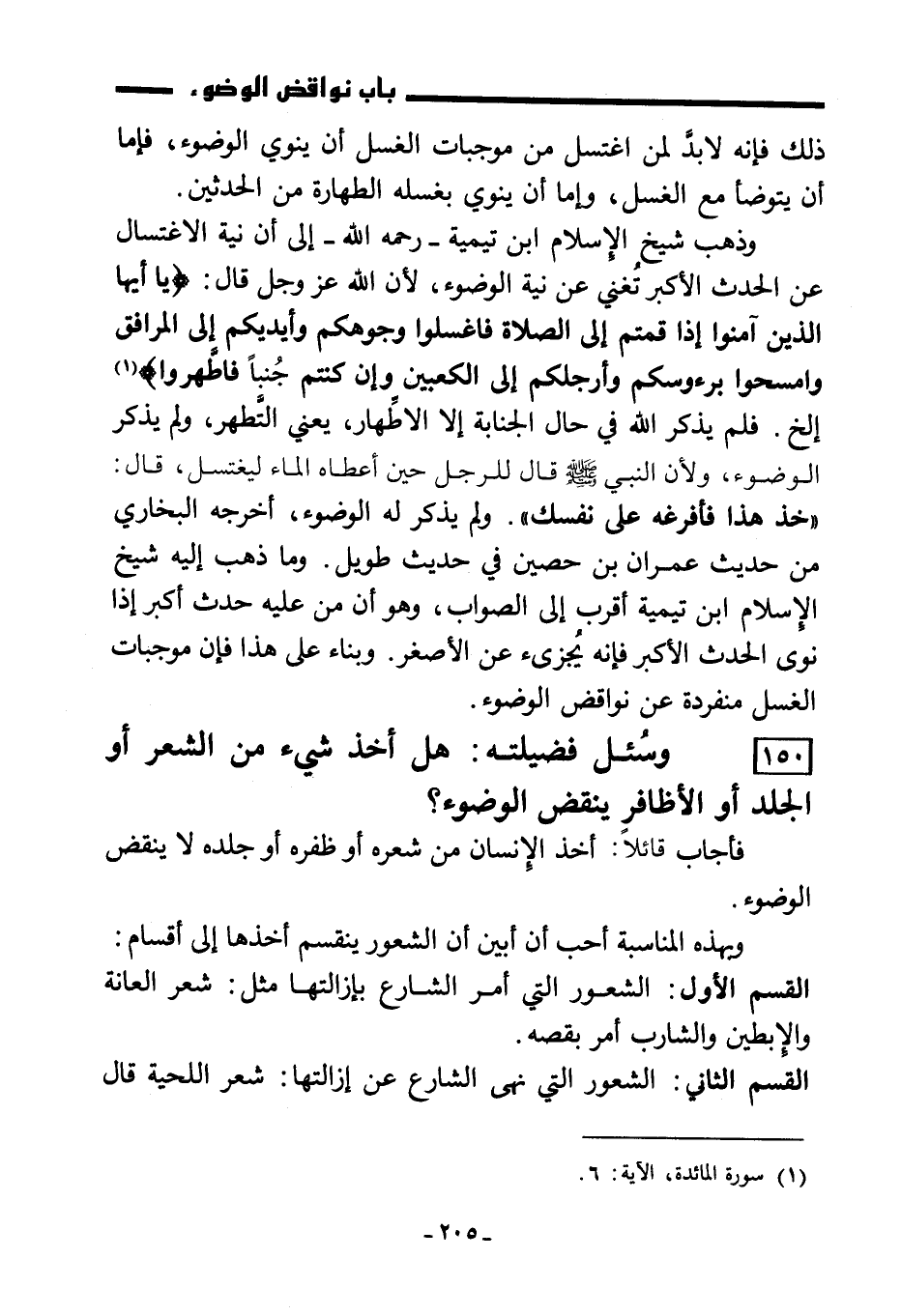 150) وسُئل فضيلته: هل أخذ شيء من الشعر أو الجلد أو الأظافر ينقض الوضوء؟