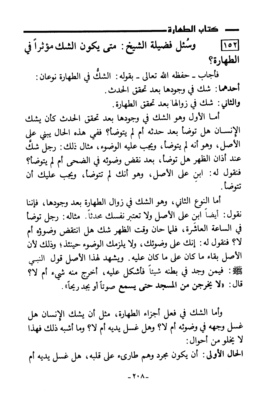 152) وسُئل فضيلة الشيخ: متى يكون الشك مؤثرا في الطهارة؟
