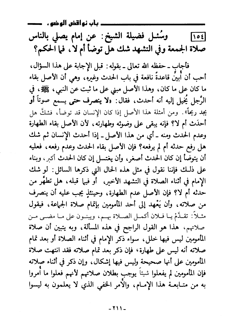 154) وسُئل فضيلة الشيخ: عن إمام يصلي بالناس صلاة الجمعة وفي التشهد شك هل توضأ أم لا، فما الحكم؟