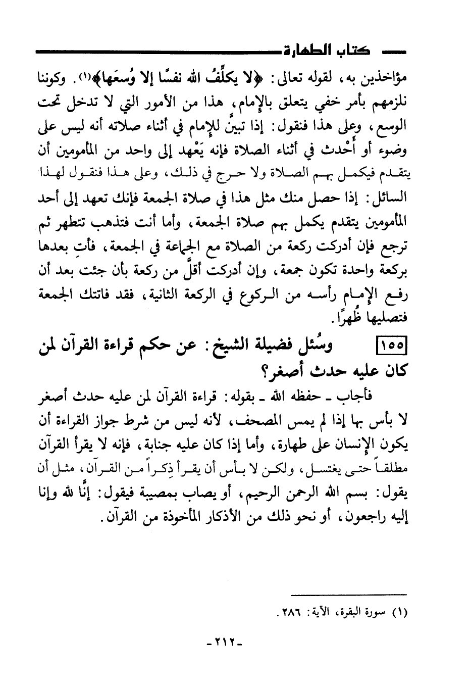 155) وسُئل فضيلة الشيخ: عن حكم قراءة القرآن لمن كان حدث أصغر؟