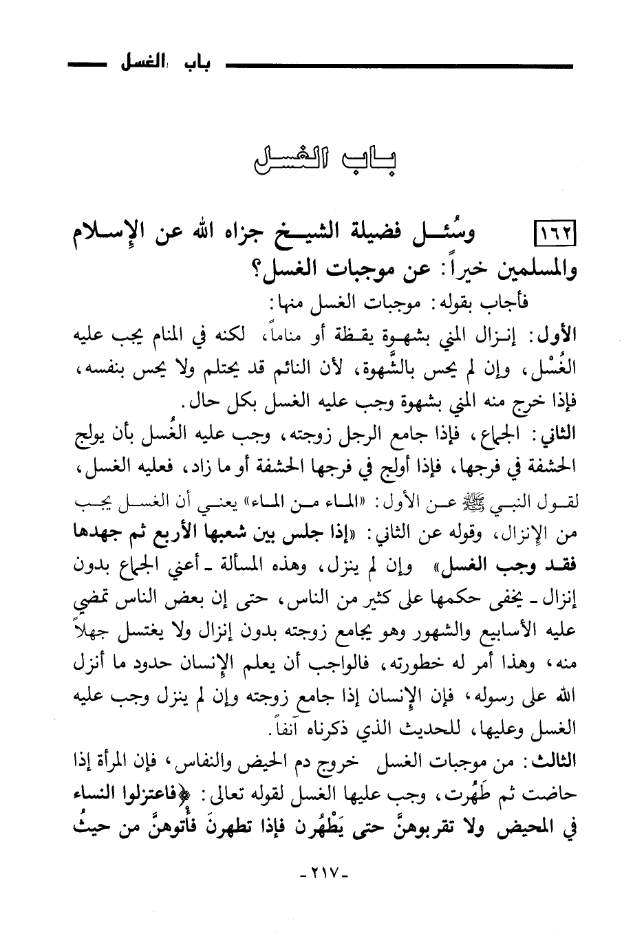 162) وسُئل فضيلة الشيخ جزاه الله عن الإسلام والمسلمين خيرا: عن موجبات الغسل؟
