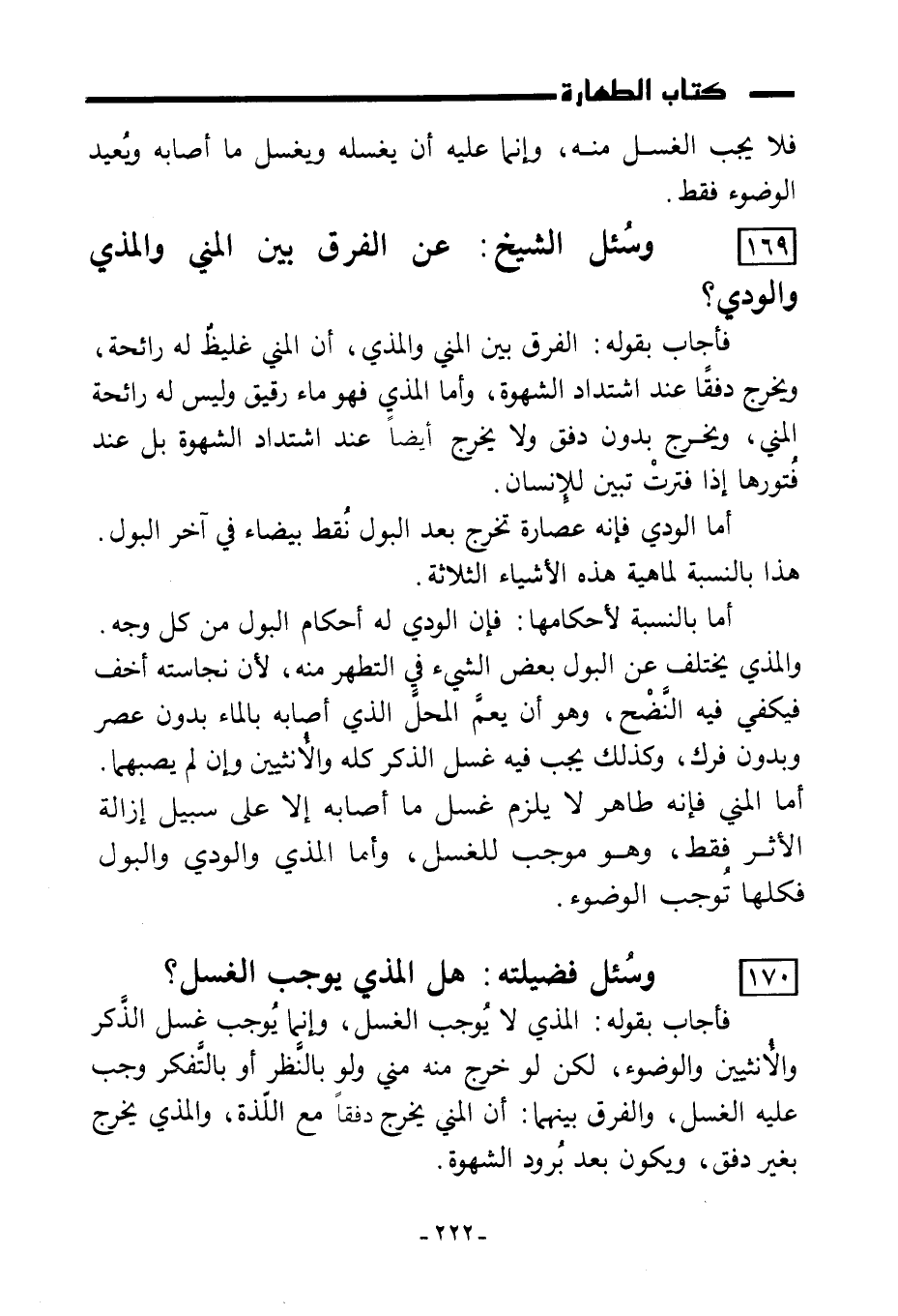 169) وسُئل الشيخ: عن الفرق بين المني والمذي والودي؟
