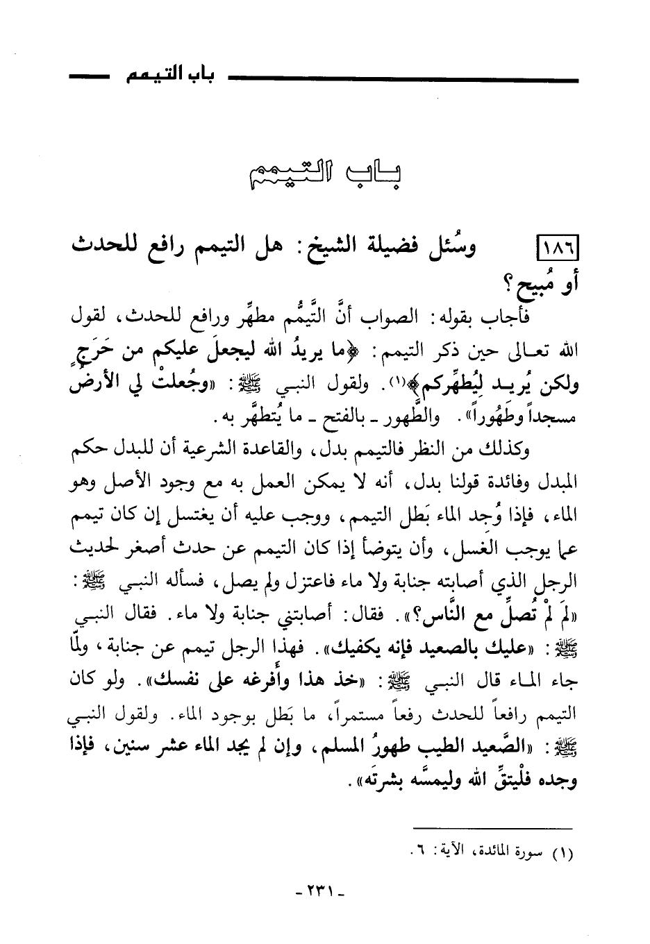 186) وسُئل فضيلة الشيخ: هل التيمم رافع للحدث أو مبيح؟