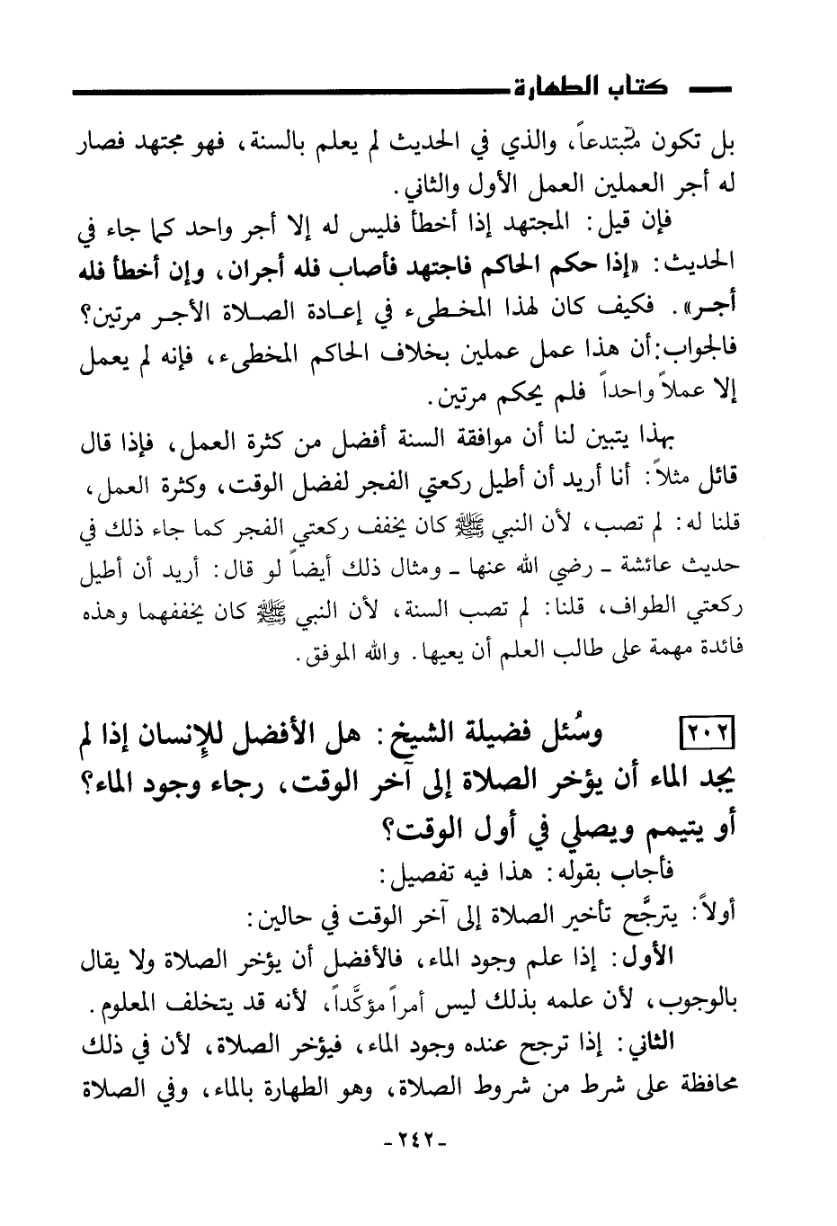 202) وسُئل فضيلة الشيخ: هل الأفضل للإنسان إذا لم يجد الماء أن يؤخر الصلاة إلى آخر الوقت، رجاء وجود الماء؟ أو يتيمم ويصلي في الوقت؟