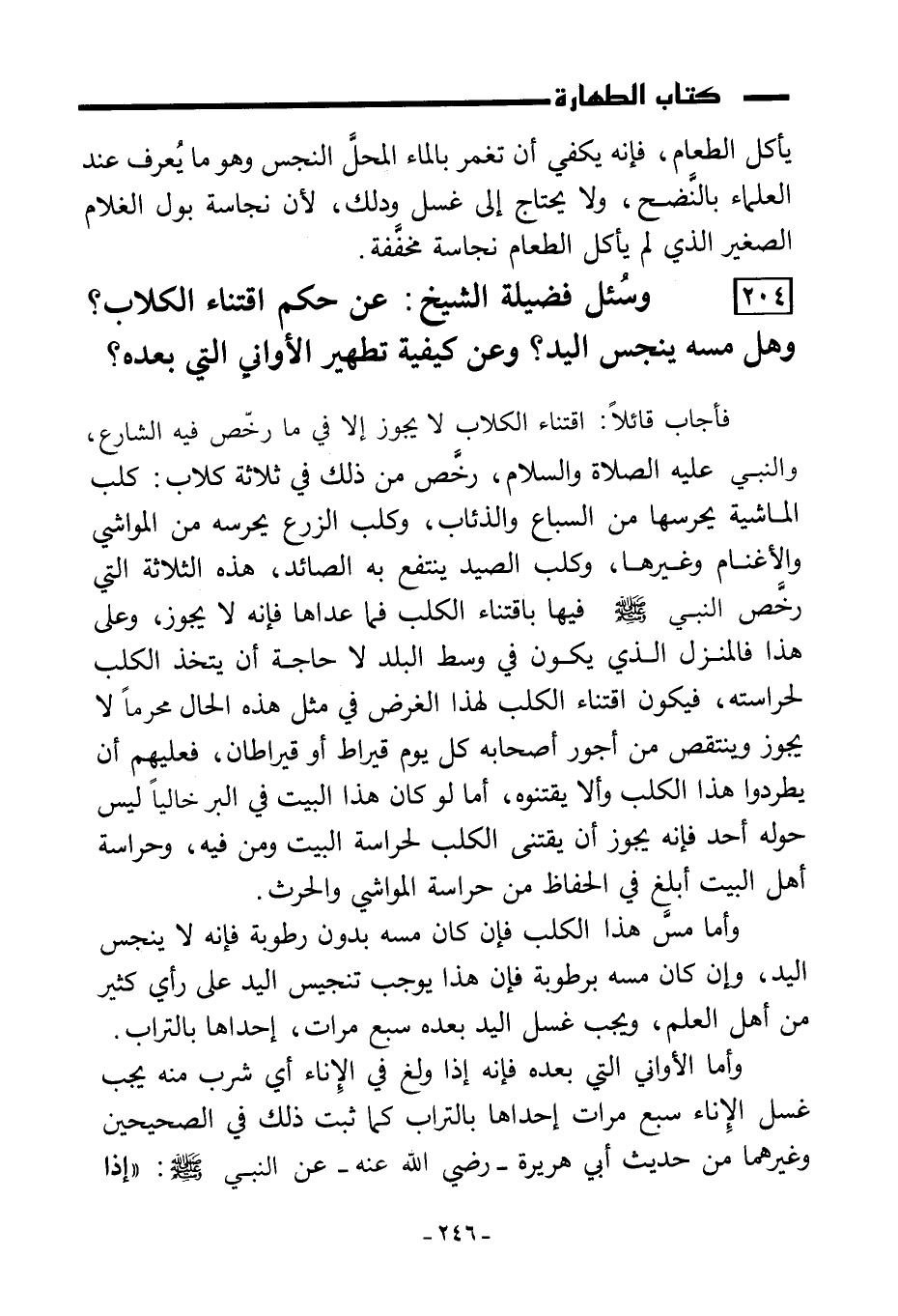 204) وسُئل فضيلة الشيخ: عن حكم اقتناء الكلاب؟ وهل مسه ينجس اليد؟ وعن كيفية تطهير الأواني التي بعده؟