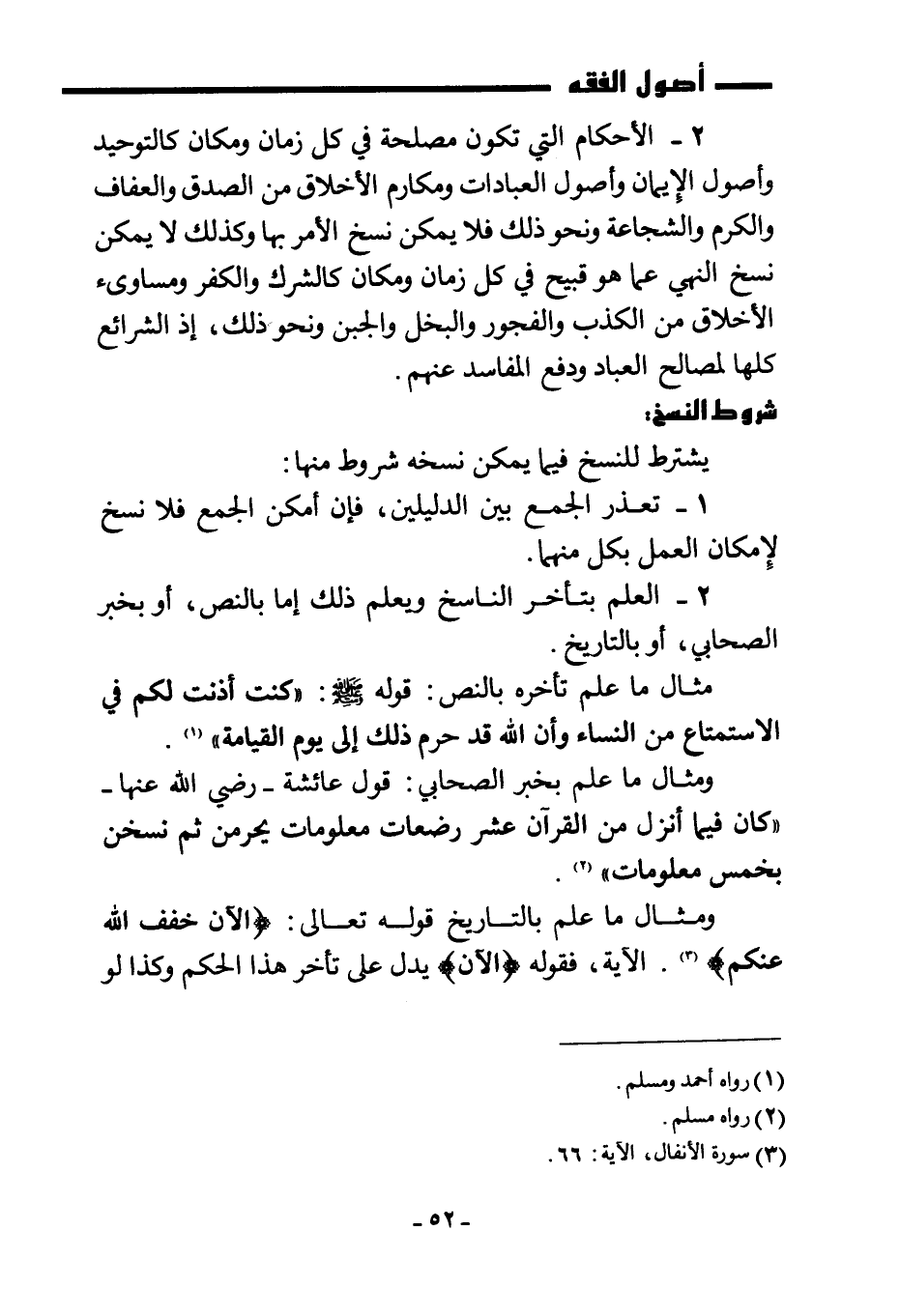 2- الأحكام التي تكون مصلحة في كل زمان ومكان كالتوحيد وأصول الإيمان وأصول العبادات ومكارم الأخلاق من الصدق والعفاف والكرم والشجاعة ونحو ذلك فلا يمكن نسخ الأمر بها وكذلك لا يمكن نسخ النهي عما هو قبيح في كل زمان ومكان كالشرك والكفر ومساوئ الأخلاق من الكذب والفجور والبخل والجبن ونحو ذلك، إذ الشرائع كلها لمصالح العباد ودفع المفاسد عنهم.