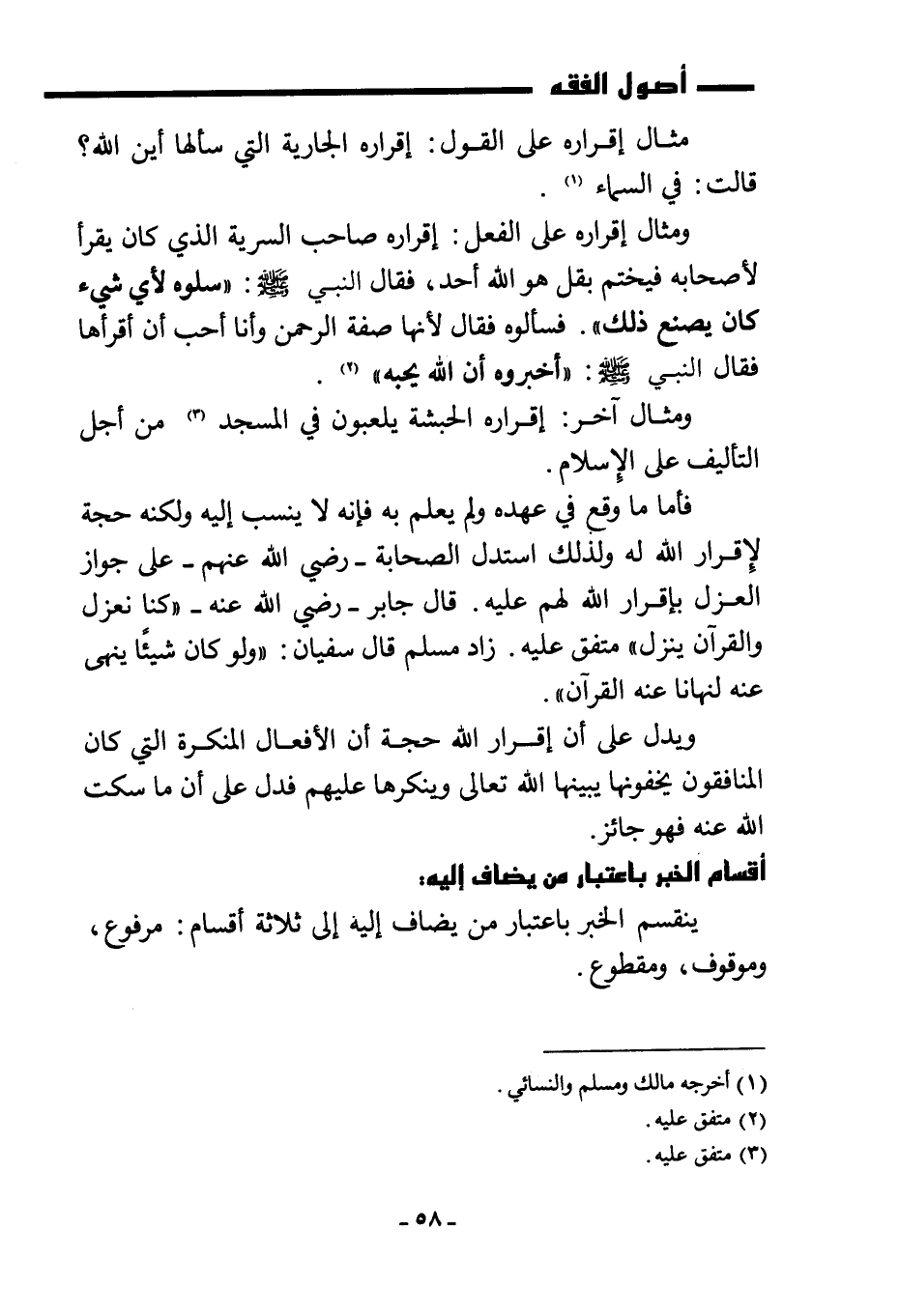 ومثال إقراره على الفعل: إقراره صاحب السرية الذي كان يقرأ لأصحابه فيختم بقل هو الله أحد، فقال النبي صلى الله عليه وسلم: " سلوه لأي شيء كان يصنع ذلك". فسألوه فقال لأنها صفة الرحمن وأنا أحب أن أقرأها فقال النبي صلى الله عليه وسلم: " أخبروه أن الله يحبه " (2) .