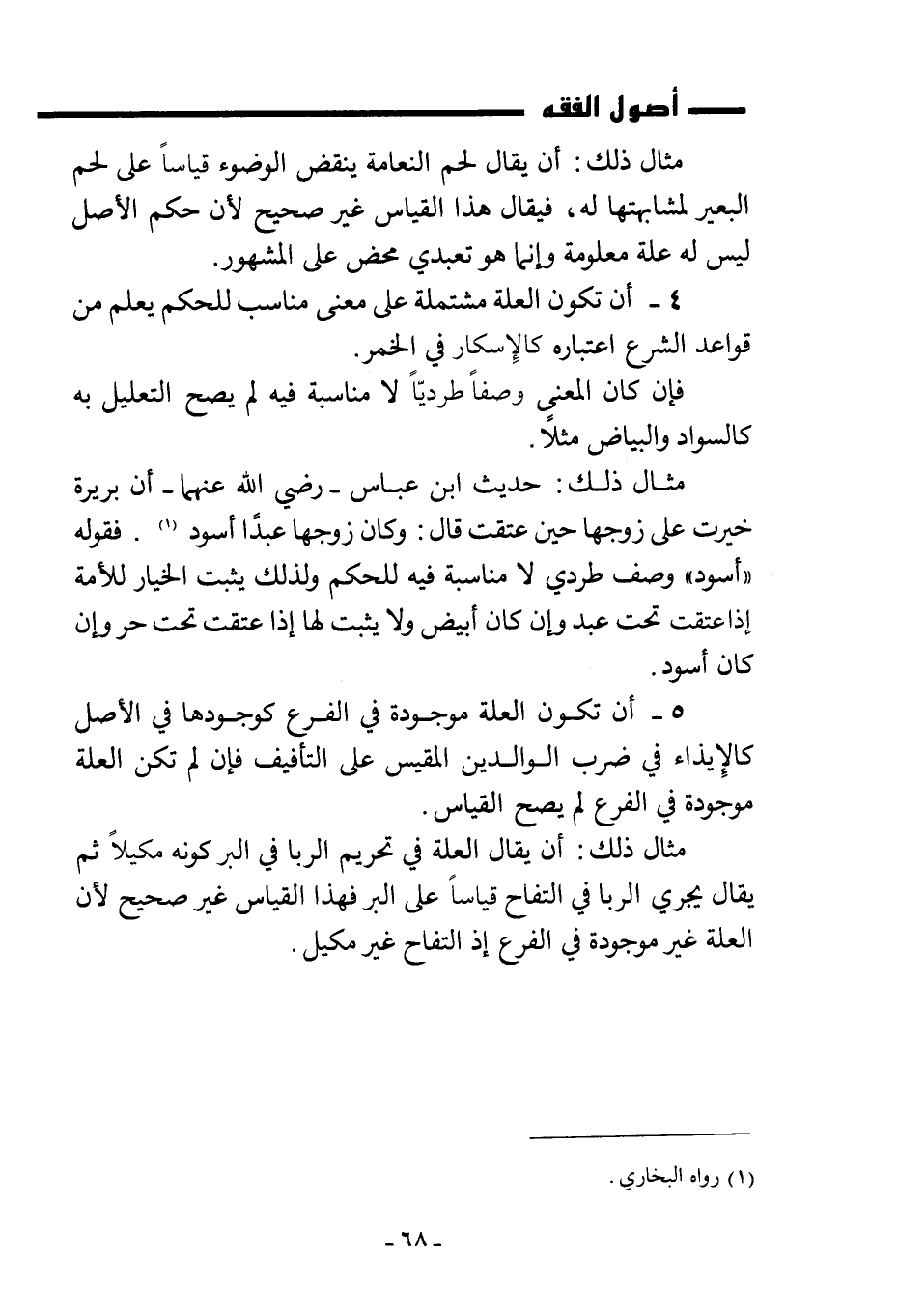 مثال ذلك: أن يقال لحم النعامة ينقض الوضوء قياساً على لحم البعير لمشابهتها له، فيقال هذا القياس غير صحيح لأن حكم الأصل ليس له عله معلومة وإنما هو تعبدي محض على المشهور.