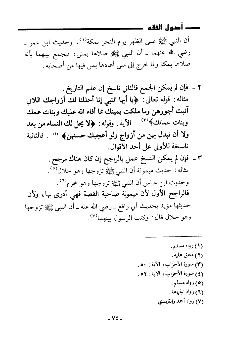 مثاله: قوله تعالى: (يا أيها النبي إنا أحللنا لك أزواجك اللاتي آتيت أجورهن وما ملكت يمينك مما أفاء الله عليك وبنات عمك وبنات عماتك) (3) الآية. وقوله تعالى: (لا يحل لك النساء من بعد) (4) . فالثانية ناسخة للأولى على أحد الأقوال.