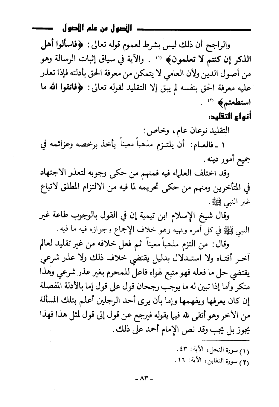 والراجح أن ذلك ليس بشرط لعموم قوله تعالى: (فَاسْأَلوا أَهْلَ الذِّكْرِ إِنْ كُنْتُمْ لا تَعْلَمُون) (1) . والآية في سياق إثبات الرسالة وهو من أصول الدين ولأن العامي لا يتمكن من معرفة الحق بأدلته فإذا تعذر عليه معرفة الحق بنفسه لم يبق إلا التقليد لقوله تعالى: (فَاتَّقُوا اللَّهَ مَا اسْتَطَعْتُمْ وَاسْمَعُوا وَأَطِيعُوا وَأَنْفِقُوا خَيْراً لِأَنْفُسِكُمْ وَمَنْ يُوقَ شُحَّ نَفْسِهِ فَأُولَئِكَ هُمُ الْمُفْلِحُونَ) (2) .