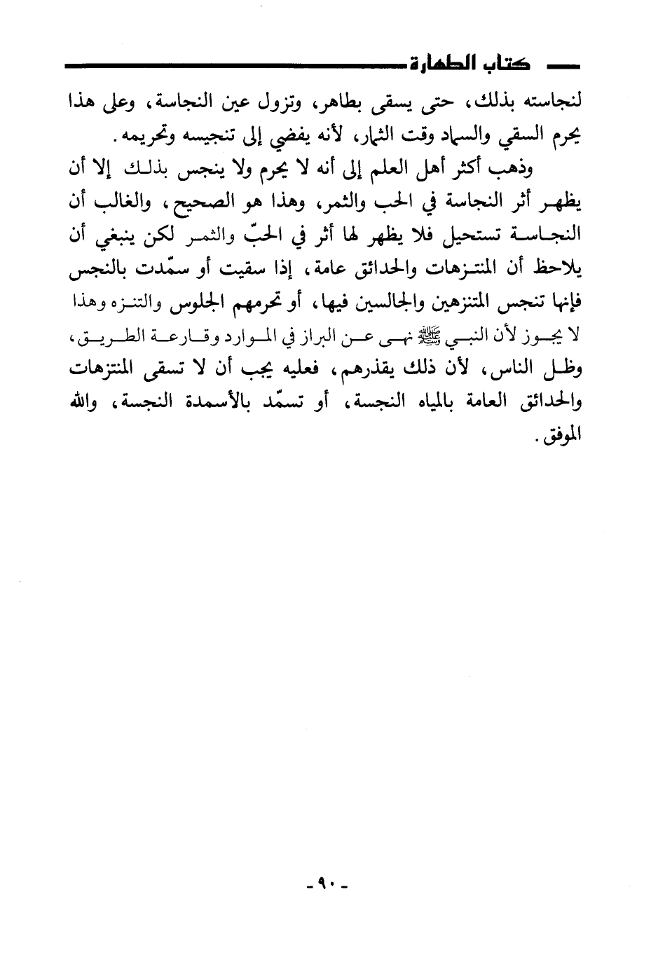 وذهب أكثر أهل العلم إلا أنه لا يحرم ولا ينجس بذلك إلا أن يظهر أثر النجاسة في الحب والثمر، وهذا هو الصحيح، والغالب أن النجاسة تستحيل فلا يظهر لها أثر في الحبّ والثمر لكن ينبغي أن يلاحظ أن المنتزهات والجالسين فيها، أو تحرمهم الجلوس والتنزه وهذا لا يجوز لأن النبي صلى الله عليه وسلم نهى عن البراز في الموارد وقارعة الطريق، وظل الناس، لأن ذلك يقذرهم، فعليه يجب أن لا تسقى المنتزهات والحدائق العامة بالمياه النجسة، أو تسمّد بالأسمدة النجسة، والله الموفق.