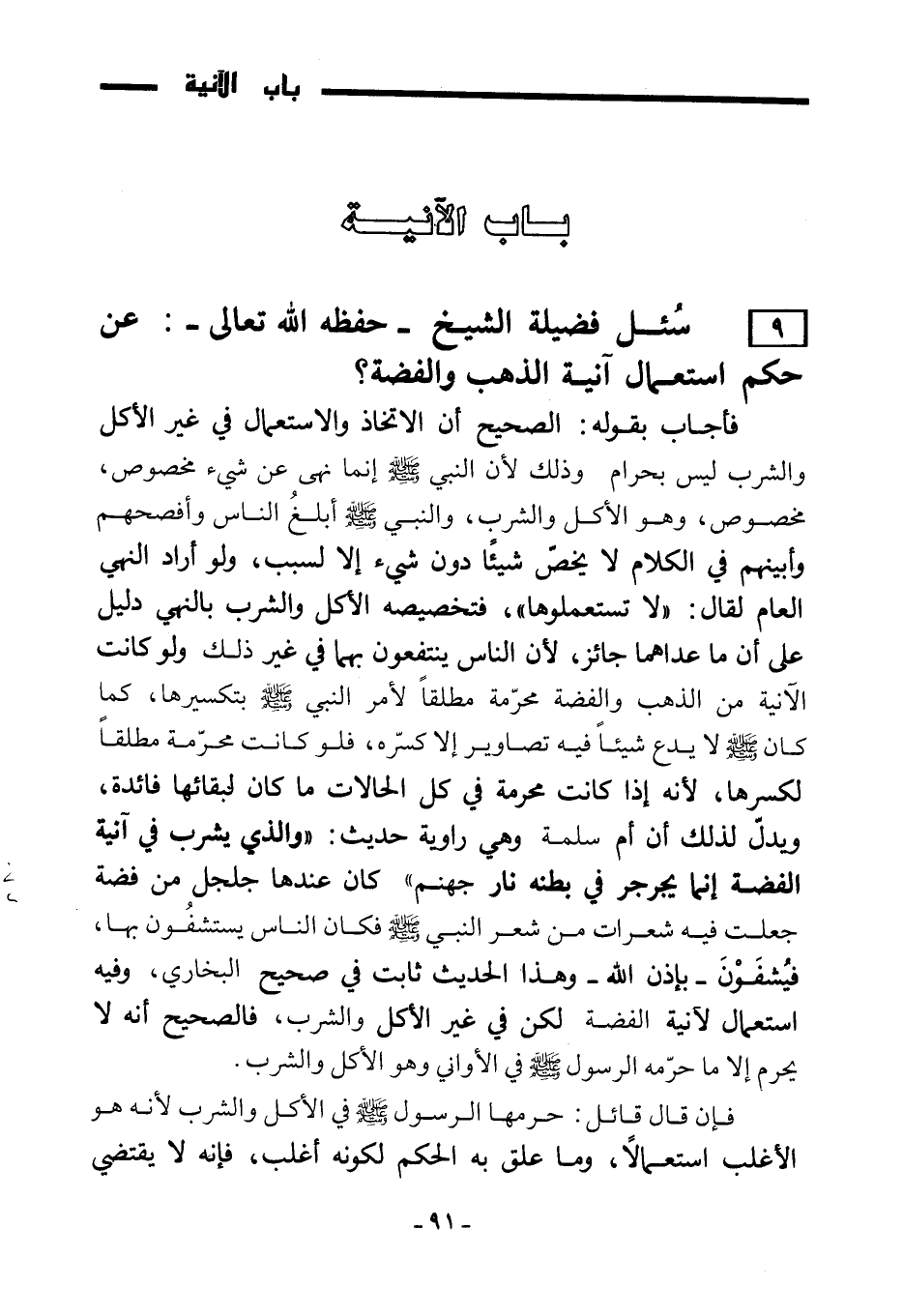 9) سُئل فضيلة الشيخ - حفظه الله تعالى: - عن حكم استعمال آنية الذهب والفضة؟