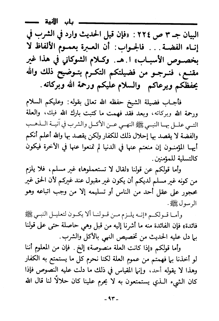 البيان ج3 ص 224: " فإن قيل الحديث وارد في الشرب في إناء الفضة.. فالجواب: أن العبرة بعموم الألفاظ لا بخصوص الأسباب " ا. هـ. وكلام الشوكاني في هذا غير مقنع، فنرجو من فضيلتكم التكرم بتوضيح ذلك والله يحفظكم ويرعاكم والسلام عليكم ورحمة الله وبركاته.