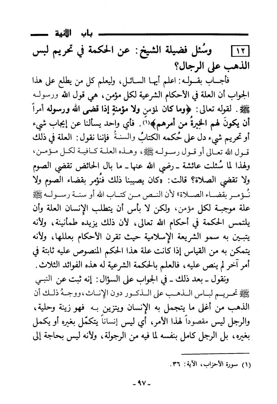 12) وسُئل فضيلة الشيخ: عن الحكمة في تحريم لبس الذهب على الرجال؟