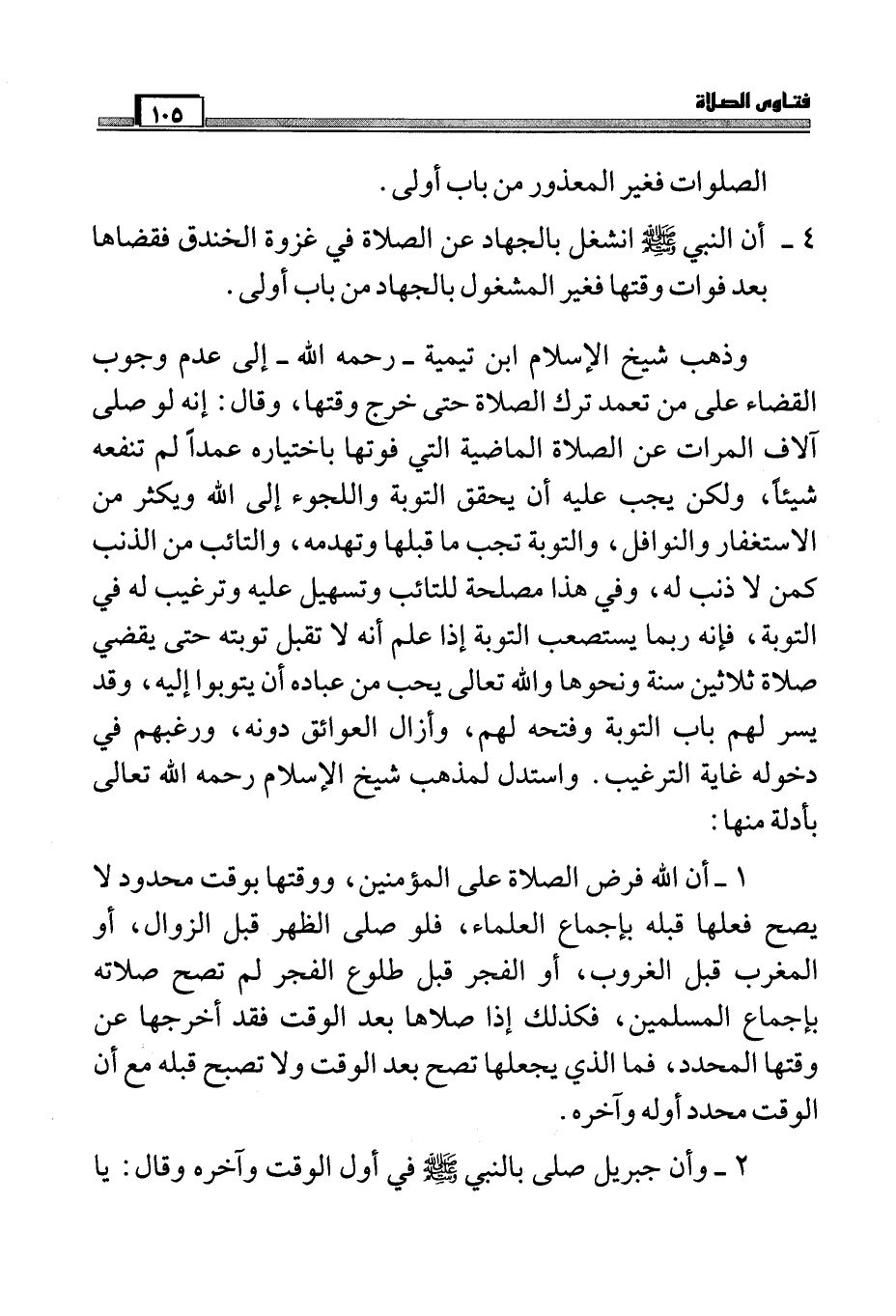 4- أن النبي صَلَّى اللَّهُ عَلَيْهِ وَسَلَّمَ انشغل بالجهاد عن الصلاة في غزوة الخندق فقضاها بعد فوات وقتها فغير المشغول بالجهاد من باب أولى.
