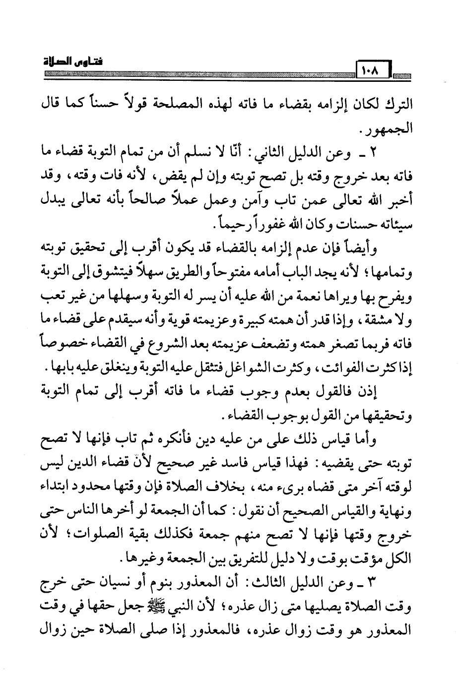 وأما قياس ذلك على من عليه دين فأنكره ثم تاب فإنها لا تصح توبته حتى يقضيه: فهذا قياس فاسد غير صحيح لأن قضاء الدين ليس لوقته آخر متى قضاه بريء منه، بخلاف الصلاة فإن وقتها محدود ابتداء ونهاية والقياس الصحيح أن نقول: كما أن الجمعة إذا أخرها الناس حتى خروج وقتها فإنها لا تصح منهم جمعة فكذلك بقية الصلوات؛ لأن الكل مؤقت بوقت ولا دليل للتفريق بين الجمعة وغيرها.