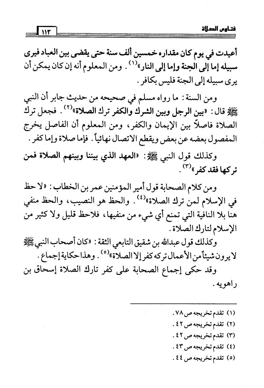 وكذلك قول النبي صَلَّى اللَّهُ عَلَيْهِ وَسَلَّمَ: " العهد الذي بيننا وبينهم الصلاة فمن تركها فقد كفر " (¬3) .ومن كلام الصحابة قول أمير المؤمنين عمر بن الخطاب: " لا حظ في الإسلام لمن ترك الصلاة " (¬4) . والحظ هو النصيب، والحظ منفي هنا بلا النافية التي تمنع أي شيء من منفيها، فلاحظ قليل ولا كثير من الإسلام لتارك الصلاة.وكذلك قول عبد الله بن شقيق التابعي الثقة: " كان أصحاب النبي صَلَّى اللَّهُ عَلَيْهِ وَسَلَّمَ لا يرون شيئاً من الأعمال تركه كفر إلا الصلاة " (¬5) .وهذا حكاية إجماع.وقد حكى إجماع الصحابة على كفر تارك الصلاة إسحاق بن راهويه.