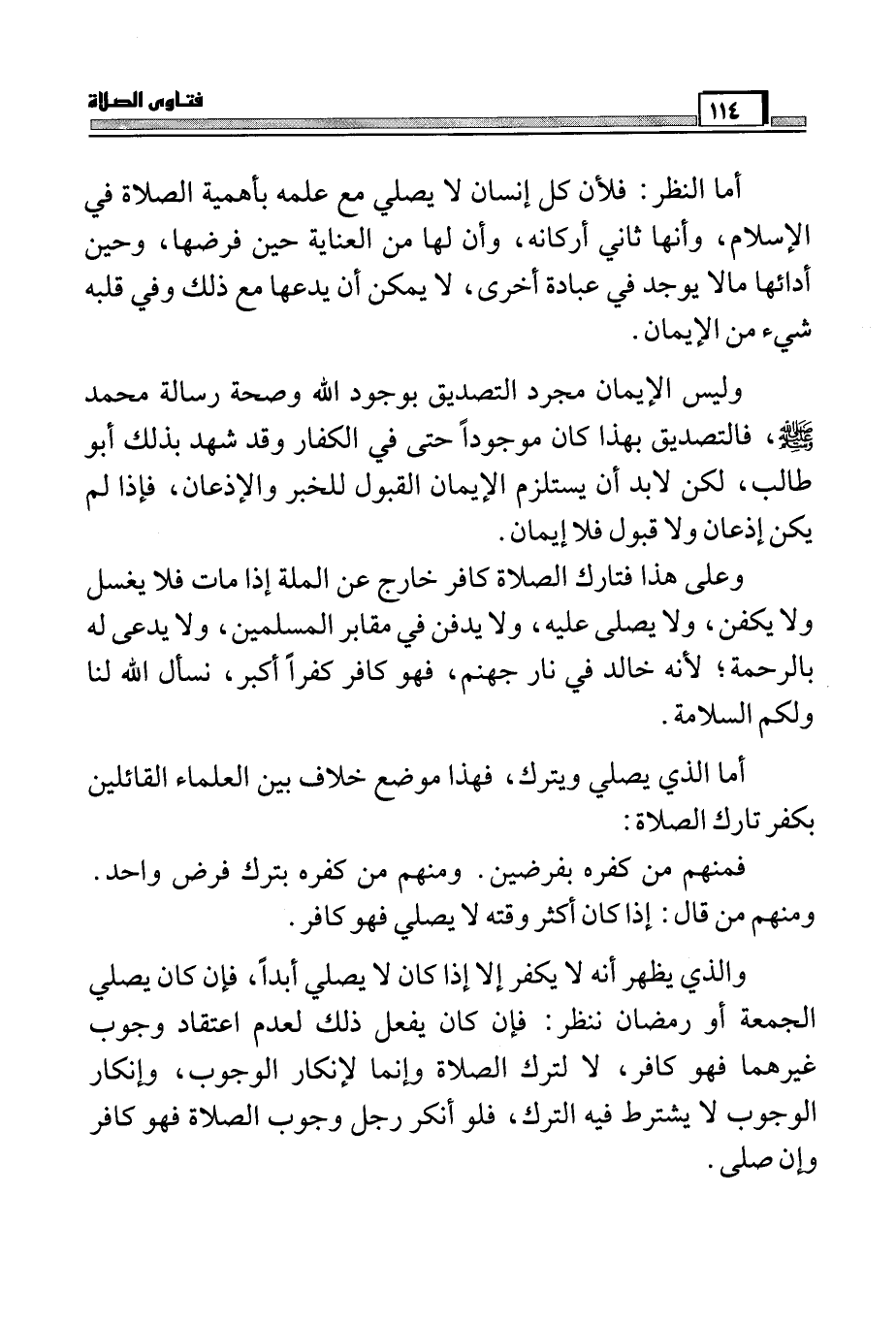 وليس الإيمان مجرد التصديق بوجود الله وصحة رسالة محمد صَلَّى اللَّهُ عَلَيْهِ وَسَلَّمَ، فالتصديق بهذا كان موجوداً حتى في الكفار وقد شهد بذلك أبو طالب، لكن لابد أن يستلزم الإيمان القبول للخبر والإذعان، فإذا لم يكن إذعان ولا قبول فلا إيمان. وعلى هذا فتارك الصلاة كافرخارج عن الملة إذا مات فلا يغسل ولا يكفن، ولا يصلى عليه، ولا يدفن في مقابر المسلمين، ولا يدعى له بالرحمة؛ لأنه خالد في نار جهنم، فهو كافر كفراً أكبر، نسأل الله لنا ولكم السلامة.أما الذي يصلي ويترك، فهذا موضع خلاف بين العلماء القائلين بكفر تارك الصلاة: