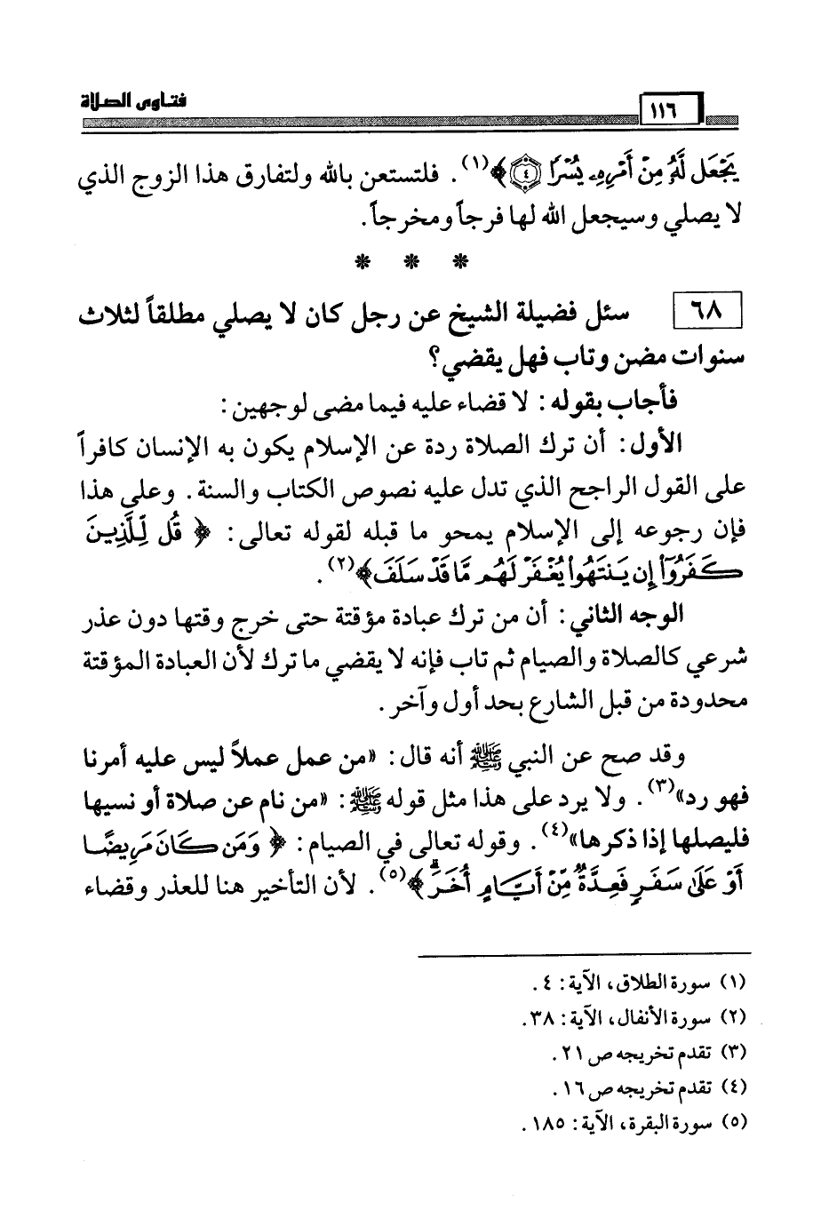 68) سئل فضيلة الشيخ عن رجل كان لا يصلي مطلقاً لثلاث سنوات مضن وتاب فهل يقضي؟