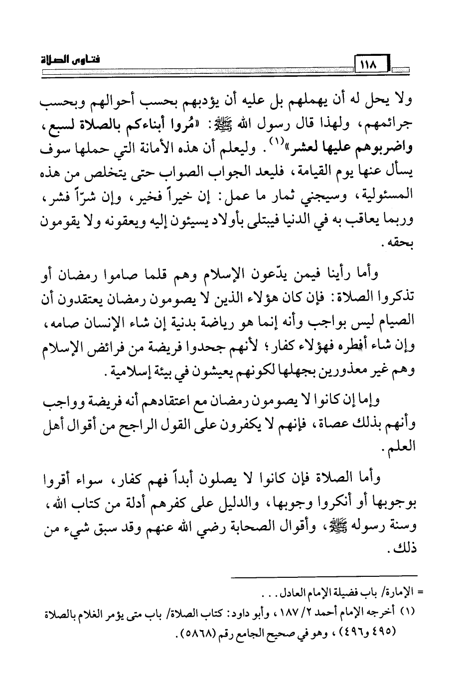 ولا يحل له أن يهملهم بل عليه أن يؤدبهم بحسب أحوالهم وبحسب جرائمهم، ولهذا قال رسول الله صَلَّى اللَّهُ عَلَيْهِ وَسَلَّمَ: " مروا أبناءكم بالصلاة لسبع، واضربوهم عليها لعشر " (¬1) . وليعلم أن هذه الأمانة التي حملها سوف يسأل عنها يوم القيامة، فليعد الجواب الصواب حتى يتخلص من هذه المسئولية، وسيجني ثمار ما عمل: إن خيراً فخير وإن شراً فشر، وربما يعاقب به في الدنيا فيبتلى بأولاد يسيئون إليه ويعقونه ولا يقومون بحقه.