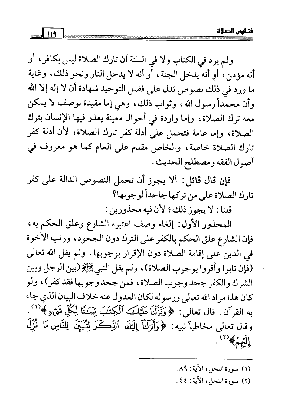 ولم يرد في الكتاب ولا في السنة أن تارك الصلاة ليس بكافر، أو أنه مؤمن، أو أنه يدخل الجنة، أو أنه لا يدخل النار ونحو ذلك، وغاية ما ورد في ذلك نصوص تدل على فضل التوحيد شهادة أن لا إله إلا الله وأن محمداً رسول الله، وثواب ذلك، وهي إما مقيدة بوصف لا يمكن معه ترك الصلاة، وإما واردة في أحوال معينة يعذر فيها الإنسان بترك الصلاة، وإما عامة فتحمل على أدلة كفر تارك الصلاة؛ لأن أدلة كفر تارك الصلاة خاصة، والخاص مقدم على العام كما هو معروف في أصول الفقه ومصطلح الحديث.