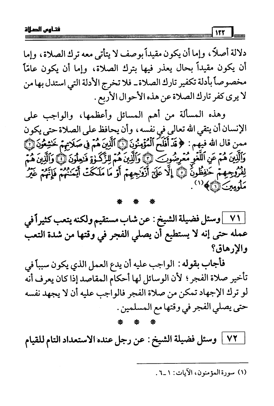 وهذه المسألة من أهم المسائل وأعظمها، والواجب على الإنسان أن يتقي الله تعالى في نفسه، وأن يحافظ على الصلاة حتى يكون ممن قال الله فيهم: (قَدْ أَفْلَحَ الْمُؤْمِنُونَ الَّذِينَ هُمْ فِي صَلاتِهِمْ خَاشِعُونَ * وَالَّذِينَ هُمْ عَنِ اللَّغْوِ مُعْرِضُونَ *وَالَّذِينَ هُمْ لِلزَّكَاةِ فَاعِلُونَ *وَالَّذِينَ هُمْ لِفُرُوجِهِمْ حَافِظُونَ * إِلَّا عَلَى أَزْوَاجِهِمْ أَوْ مَا مَلَكَتْ أَيْمَانُهُمْ فَإِنَّهُمْ غَيْرُ مَلُومِينَ) (¬1) .
