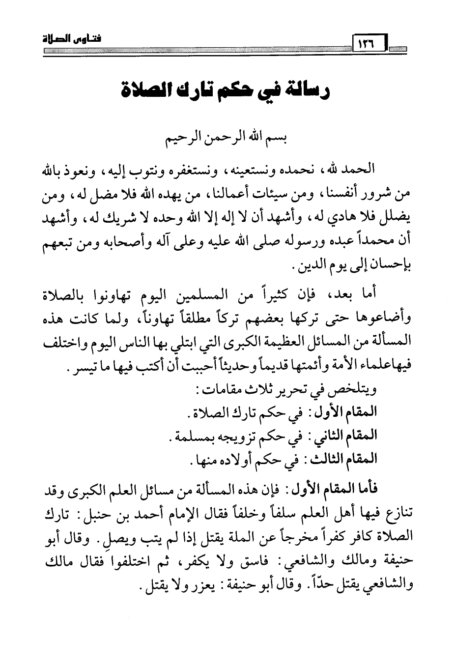 فأما المقام الأول: فإن هذه المسألة من مسائل العلم الكبرى وقد تنازع فيها أهل العلم سلفاً وخلفاً فقال الإمام أحمد بن حنبل: تارك الصلاة كافر كفراً مخرجاً عن الملة يقتل إذا لم يتب ويصلِ. وقال أبو حنيفة ومالك والشافعي: فاسق ولا يكفر، ثم اختلفوا فقال مالك والشافعي يقتل حداً. وقال أبو حنيفة: يعزر ولا يقتل.