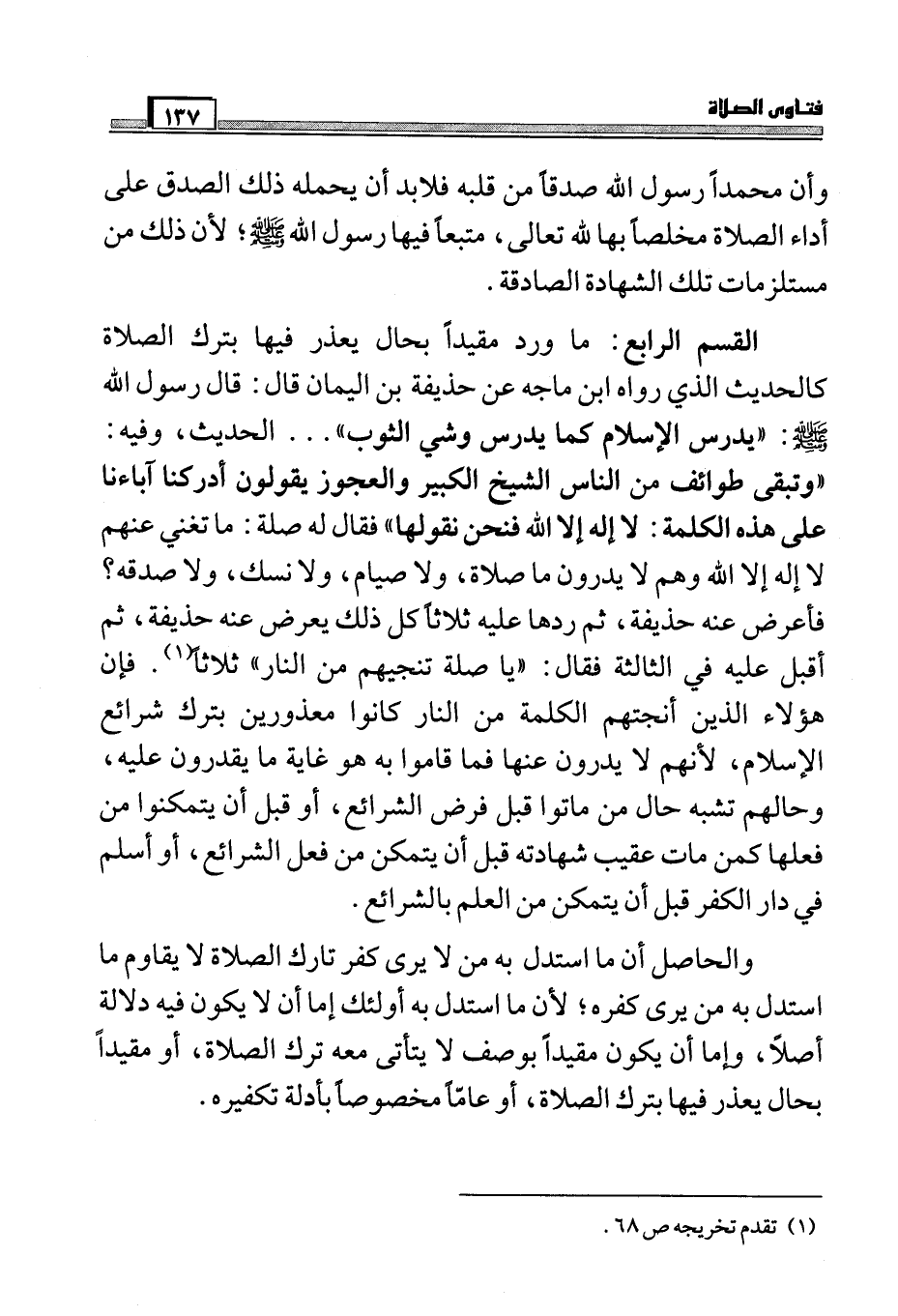 القسم الرابع: ما ورد مقيداً بحال يعذر فيها بترك الصلاة كالحديث الذي رواه ابن ماجه عن حذيفة بن اليمان قال: قال رسول الله صَلَّى اللَّهُ عَلَيْهِ وَسَلَّمَ: " يدرس الإسلام كما يدرس وشي الثوب ". الحديث، وفيه: " وتبقى طوائف من الناس الشيخ الكبير والعجوز يقولون أدركنا آباءنا على هذه الكلمة: لا إله إلا الله فنحن نقولها " فقال له صلة: ما تغني عنهم لا إله إلا الله وهم لا يدرون ما صلاة، ولا صيام، ولا نسك، ولا صدقة؟ فأعرض عنه حذيفة، ثم ردها عليه ثلاثاً كل ذلك يعرض عنه حذيفة، ثم أقبل عليه في الثالثة فقال: " يا صلة تنجيهم من النار " ثلاثاً (¬1) . فإن هؤلاء الذين أنجتهم الكلمة من النار كانوا معذورين بترك شرائع الإسلام، لأنهم لا يدرون عنها فما قاموا به هو غاية ما يقدرون عليه، وحالهم تشبه حال من ماتوا قبل فرض الشرائع، أو قبل أن يتمكنوا من فعلها كمن مات عقب شهادته قبل أن يتمكن من فعل الشرائع، أو أسلم في دار الكفر قبل أن يتمكن من العلم بالشرائع.