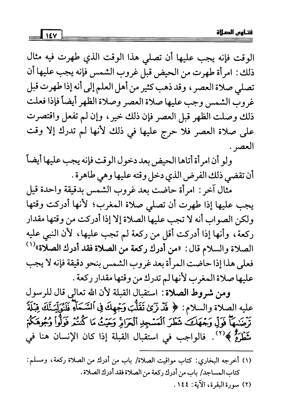 مثال آخر: امرأة حاضت بعد غروب الشمس بدقيقة واحدة قيل يجب عليها إذا طهرت أن تصلي صلاة المغرب؛ لأنها أدركت وقتها ولكن الصواب أنه لا تجب عليها الصلاة إلا إذا أدركت من وقتها مقدار ركعة، وأنها إذا أدركت أقل من ركعة لم تجب عليها، لأن النبي عليه الصلاة والسلام قال: " من أدرك ركعة من الصلاة فقد أدرك الصلاة " (¬1) . فعلى هذا إذا حاضت المرأة بعد غروب الشمس بنحو دقيقة فإنه لا يجب عليها صلاة المغرب لأنها لم تدرك من وقتها مقدار ركعة.