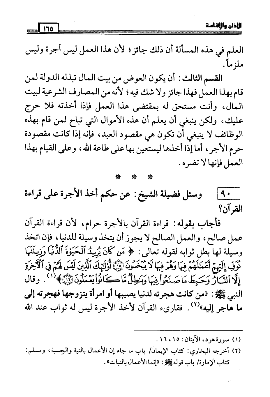 فأجاب بقوله: قراءة القرآن بالأجرة حرام، لأن قراءة القرآن عمل صالح، والعمل الصالح لا يجوز أن يتخذ وسيلة للدنيا، فإن اتخذ وسيلة لها بطل ثوابه لقوله تعالى: (مَنْ كَانَ يُرِيدُ الْحَيَاةَ الدُّنْيَا وَزِينَتَهَا نُوَفِّ إِلَيْهِمْ أَعْمَالَهُمْ فِيهَا وَهُمْ فِيهَا لا يُبْخَسُونَ *أُولَئِكَ الَّذِينَ لَيْسَ لَهُمْ فِي الْآخِرَةِ إِلَّا النَّارُ وَحَبِطَ مَا صَنَعُوا فِيهَا وَبَاطِلٌ مَا كَانُوا يَعْمَلُونَ) (¬1) . وقال النبي صَلَّى اللَّهُ عَلَيْهِ وَسَلَّمَ: " من كانت هجرته لدنيا يصيبها أو امرأة يتزوجها فهجرته إلى ما هاجر إليه " (¬2) . فقاريء القرآن لأخذ الأجرة ليس له ثواب عند الله