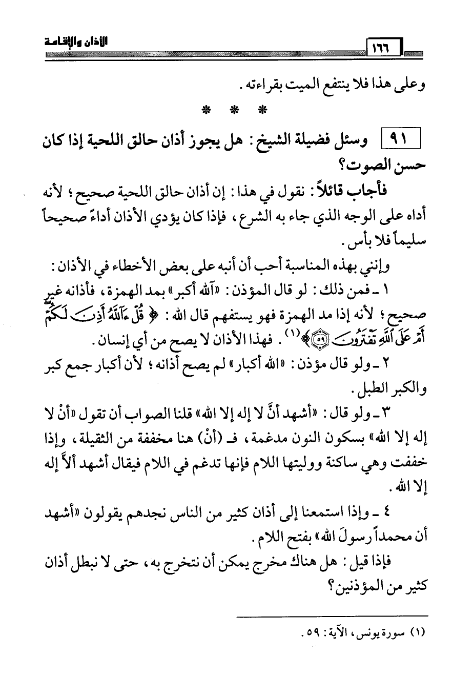 91) وسئل فضيلة الشيخ: هل يجوز أذان حالق اللحية إذا كان حسن الصوت؟