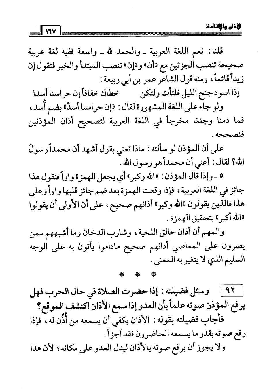 92) وسئل فضيلته: إذا حضرت الصلاة في حال الحرب فهل يرفع المؤذن صوته علماً بأن العدو إذا سمع الأذان اكتشف الموقع؟