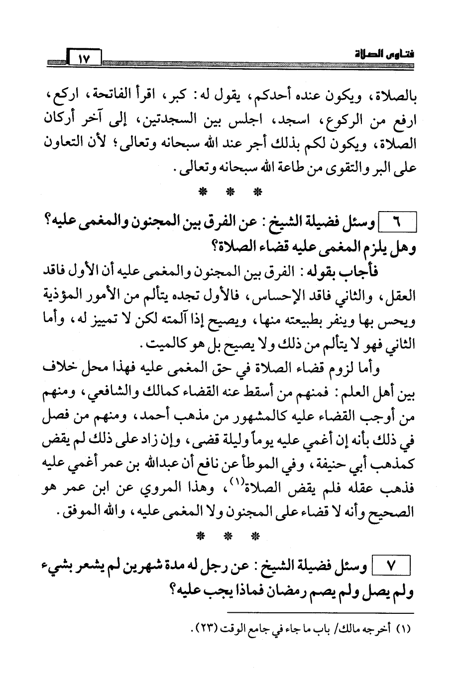6) وسئل فضيلة الشيخ: عن الفرق بين المجنون والمغمى عليه؟ وهل يلزم