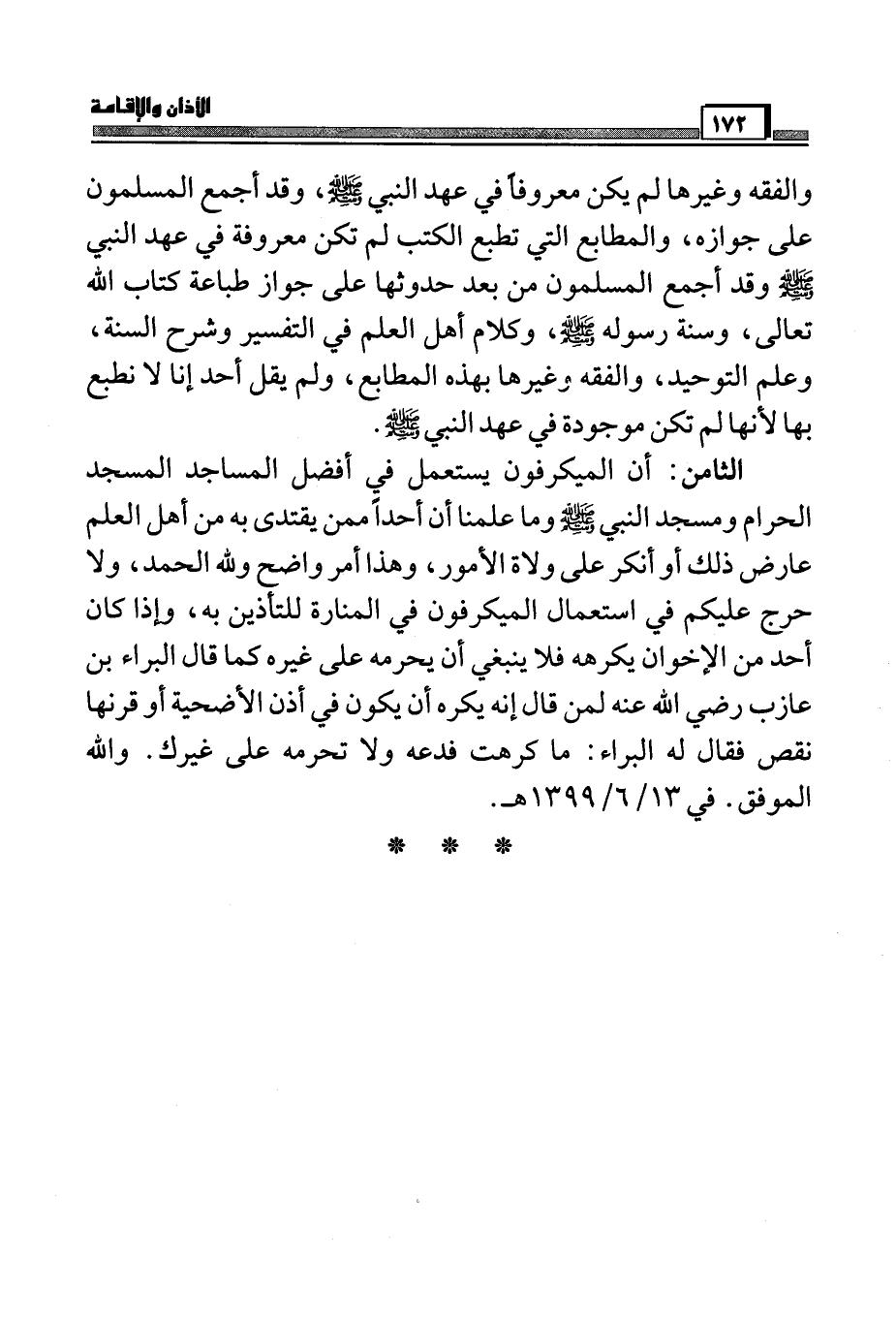 الثامن: أن الميكروفون يستعمل في أفضل المساجد المسجد الحرام ومسجد النبي صَلَّى اللَّهُ عَلَيْهِ وَسَلَّمَ وما علمنا أن أحداً ممن يقتدي به من أهل العلم عارض ذلك أو أنكر على ولاة الأمور، وهذا أمر واضح ولله الحمد، ولا حرج عليكم في استعمال الميكروفون في المنارة للتأذين به، وإذا كان أحد من الإخوان يكرهه فلا ينبغي أن يحرمه على غيره كما قال البراء بن عازب رضي الله عنه لمن قال إنه يكره أن يكون في أذن الأضحية أو قرنها نقص فقال له البراء: ما كرهت فدعه ولا تحرمه على غيرك. والله الموفق. في 13/6/1399 هـ.