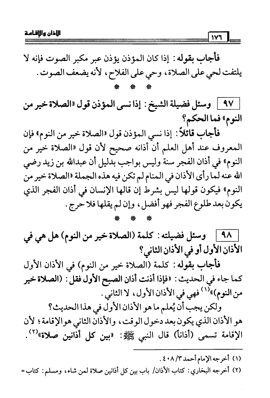 98) وسئل فضيلته: كلمة (الصلاة خير من النوم) هل هي في الأذان الأول أو في الأذان الثاني؟