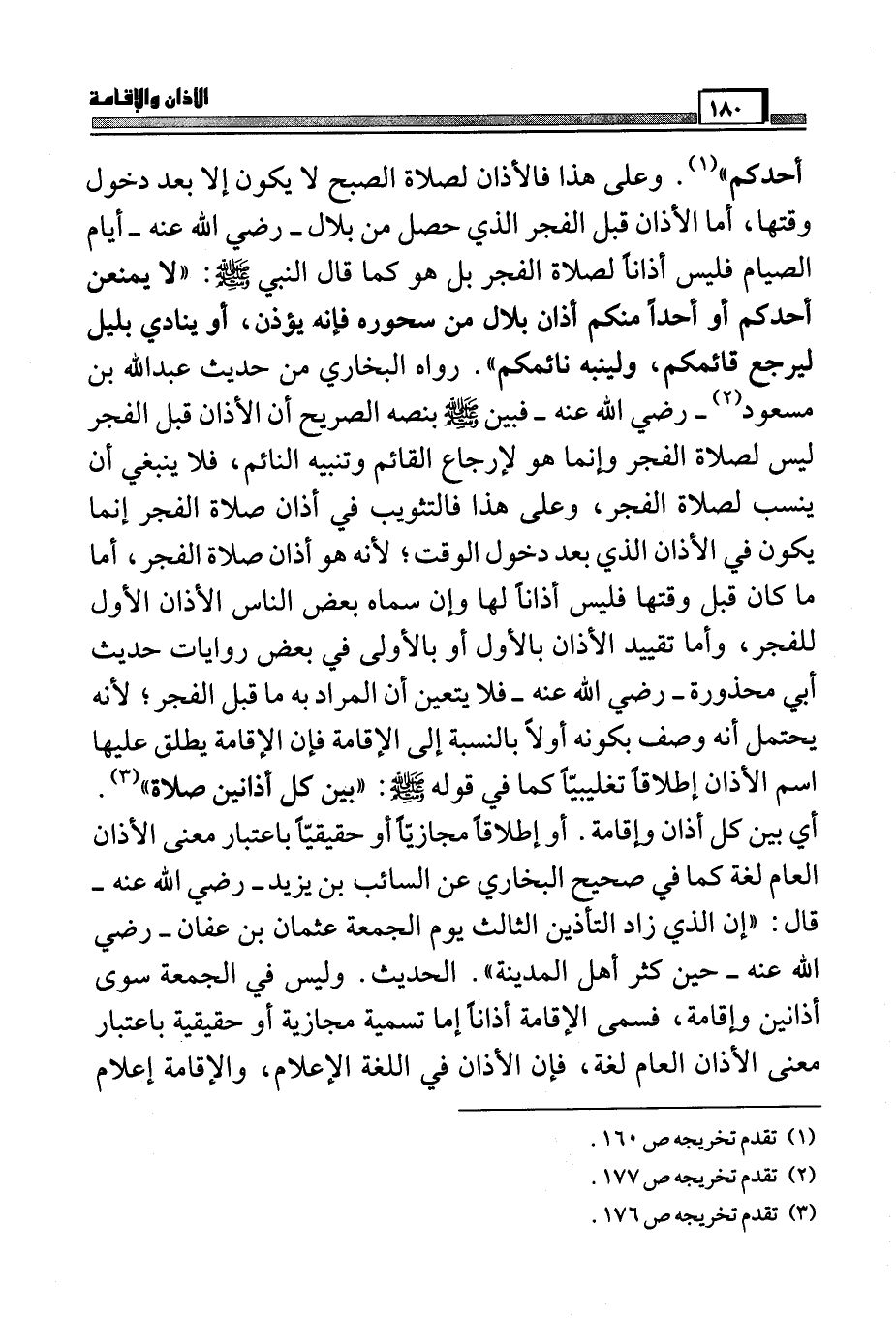 أحدكم " (¬1) . وعلى هذا فالأذان لصلاة الصبح لا يكون إلا بعد دخول وقتها، أما الأذان قبل الفجر الذي حصل من بلال – رضي الله عنه – أيام الصيام فليس أذاناً لصلاة الفجر بل هو كما قال النبي صَلَّى اللَّهُ عَلَيْهِ وَسَلَّمَ: " لا يمنعن أحدكم أو أحد منكم أذان بلال من سحوره فإنه يؤذن، أو ينادي بليل ليرجع قائمكم، ولينبه نائمكم ". رواه البخاري من حديث عبد الله بن مسعود (¬2) – رضي الله عنه – فبين صَلَّى اللَّهُ عَلَيْهِ وَسَلَّمَ بنصه الصريح أن الأذان قبل الفجر ليس لصلاة الفجر وإنما هو لإرجاع القائم وتنبيه النائم، فلا ينبغي أن ينسب لصلاة الفجر، وعلى هذا فالتثويب في أذان صلاة الفجر إنما يكون في الأذان الذي بعد دخول الوقت؛ لأنه هو أذان صلاة الفجر، أما ما كان قبل وقتها فليس أذاناً لها وإن سماه بعض الناس الأذان الأول للفجر، وأما تقييد الأذان بالأول أو بالأولي في بعض روايات حديث أبي محذورة – رضي الله عنه – فلا يتعين أن المراد به ما قبل الفجر؛ لأنه يحتمل أنه وصف بكونه أولاً بالنسبة إلى الإقامة فإن الإقامة يطلق عليها اسم الأذان إطلاقاً تغليبياً كما في قوله صَلَّى اللَّهُ عَلَيْهِ وَسَلَّمَ: " بين كل أذانين صلاة " (¬3) . أي بين كل أذان وإقامة. أو إطلاقاً مجازياً أو حقيقياً باعتبار معنى الأذان العام لغة كما في صحيح البخاري عن السائب بن يزيد – رضي الله عنه – قال: " إن الذي زاد التأذين الثالث يوم الجمعة عثمان بن عفان – رضي الله عنه – حين كثر أهل المدينة ". الحديث.