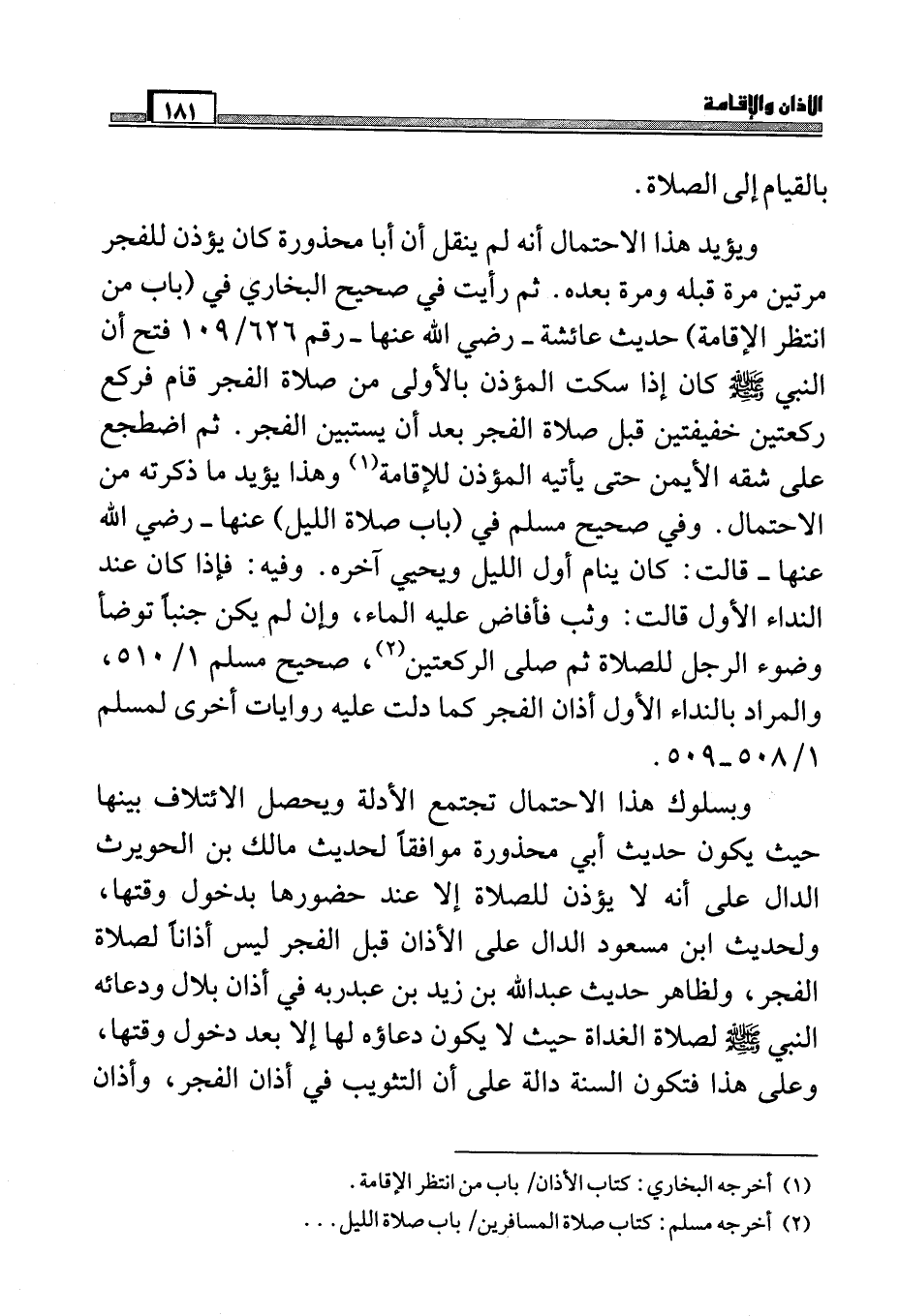 ويؤيد هذا الاحتمال أنه لم ينقل أن أبا محذورة كان يؤذن للفجر مرتين مرة قبله ومرة بعده. ثم رأيت في صحيح البخاري في (باب من انتظر الإقامة) حديث عائشة – رضي الله عنها – رقم 626 / 109 فتح أن النبي صَلَّى اللَّهُ عَلَيْهِ وَسَلَّمَ كان إذا سكت المؤذن بالأولى من صلاة الفجر قام فركع ركعتين خفيفتين قبل صلاة الفجر بعد أن يستبين الفجر. ثم اضطجع على شقه الأيمن حتى يأتيه المؤذن للإقامة (¬1) وهذا يؤيد ما ذكرته من الاحتمال. وفي صحيح مسلم في (باب صلاة الفجر) عنها – رضي الله عنها – قالت: كان ينام أول الليل ويحيي آخره. وفيه: فإذا كان عند النداء الأول قالت: وثب فأفاض عليه الماء، وإن لم يكن جنباً توضأ وضوء الرجل للصلاة ثم صلى الركعتين (¬2) ، صحيح مسلم 1/ 510، والمراد بالنداء الأول أذان الفجر كما دلت عليه روايات أخرى لمسلم 1/508 –509.