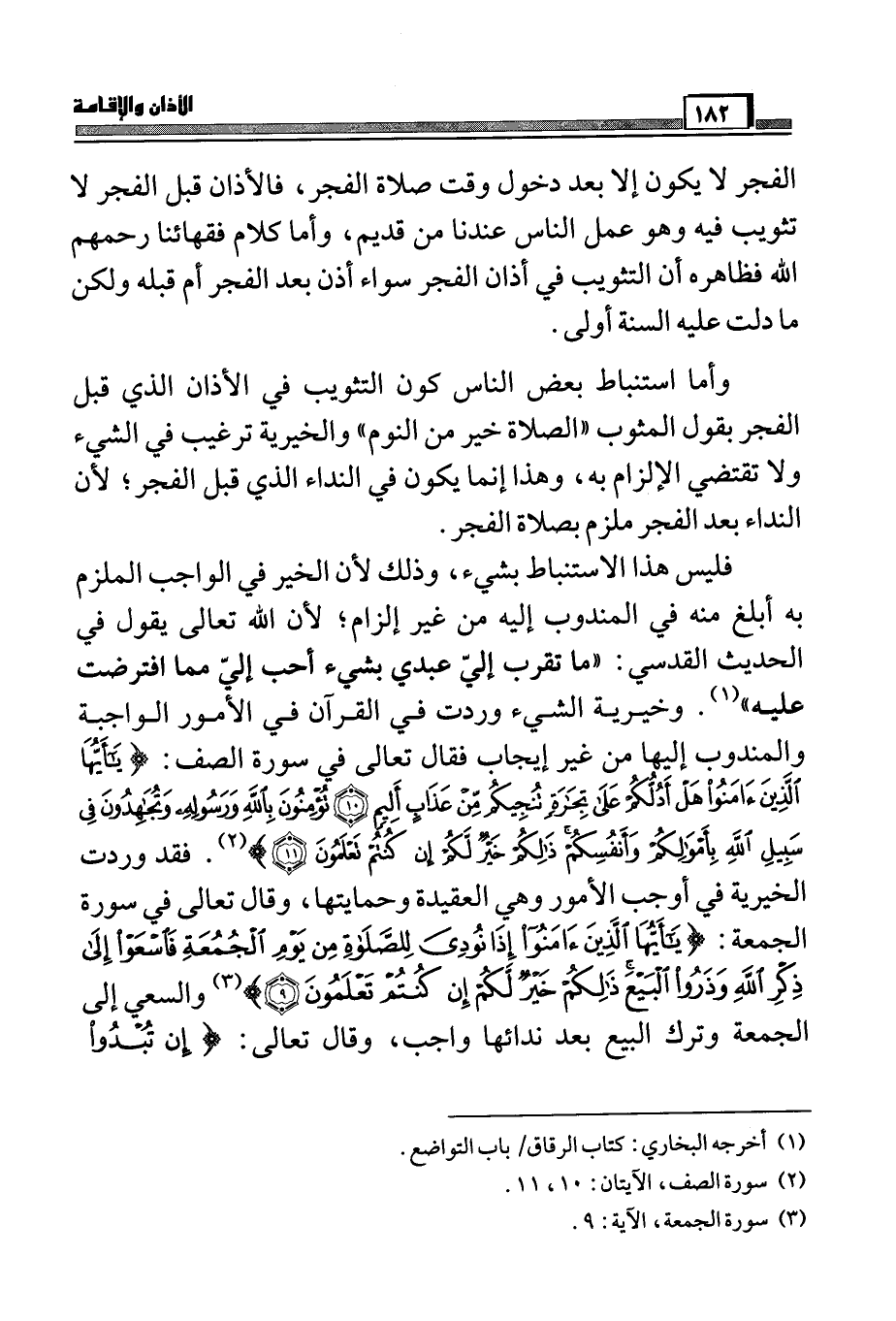 وأما استنباط بعض الناس كون التثويب في الأذان الذي قبل الفجر بقول المثوب " الصلاة خير من النوم " والخيرية ترغيب في الشيء ولا تقتضي الإلزام به، وهذا إنما يكون في النداء الذي قبل الفجر؛ لأن النداء بعد الفجر ملزم بصلاة الفجر. فليس هذا الاستنباط بشيء، وذلك لأن الخير في الواجب الملزم به أبلغ منه في المندوب إليه من غير إلزام؛ لأن الله تعالى يقول في الحديث القدسي: " ما تقرب إلي عبدي بشيء أحب إلي مما افترضت عليه " (¬1) . وخيرية الشيء وردت في القرآن في الأمور الواجبة والمندوب إليها من غير إيجاب فقال تعالى في سورة الصف: (يَا أَيُّهَا الَّذِينَ آمَنُوا هَلْ أَدُلُّكُمْ عَلَى تِجَارَةٍ تُنْجِيكُمْ مِنْ عَذَابٍ أَلِيمٍ * تُؤْمِنُونَ بِاللَّهِ وَرَسُولِهِ وَتُجَاهِدُونَ فِي سَبِيلِ اللَّهِ بِأَمْوَالِكُمْ وَأَنْفُسِكُمْ ذَلِكُمْ خَيْرٌ لَكُمْ إِنْ كُنْتُمْ تَعْلَمُونَ) (¬2) . فقد وردت الخيرية في أوجب الأمور وهي العقيدة وحمايتها، وقال تعالى في سورة الجمعة: (يَا أَيُّهَا الَّذِينَ آمَنُوا إِذَا نُودِيَ لِلصَّلاةِ مِنْ يَوْمِ الْجُمُعَةِ فَاسَعَوْا إِلَى ذِكْرِ اللَّهِ وَذَرُوا الْبَيْعَ ذَلِكُمْ خَيْرٌ لَكُمْ إِنْ كُنْتُمْ تَعْلَمُونَ) (¬3) . والسعي إلى الجمعة وترك البيع بعد ندائها واجب، وقال تعالى: (إِنْ تُبْدُوا