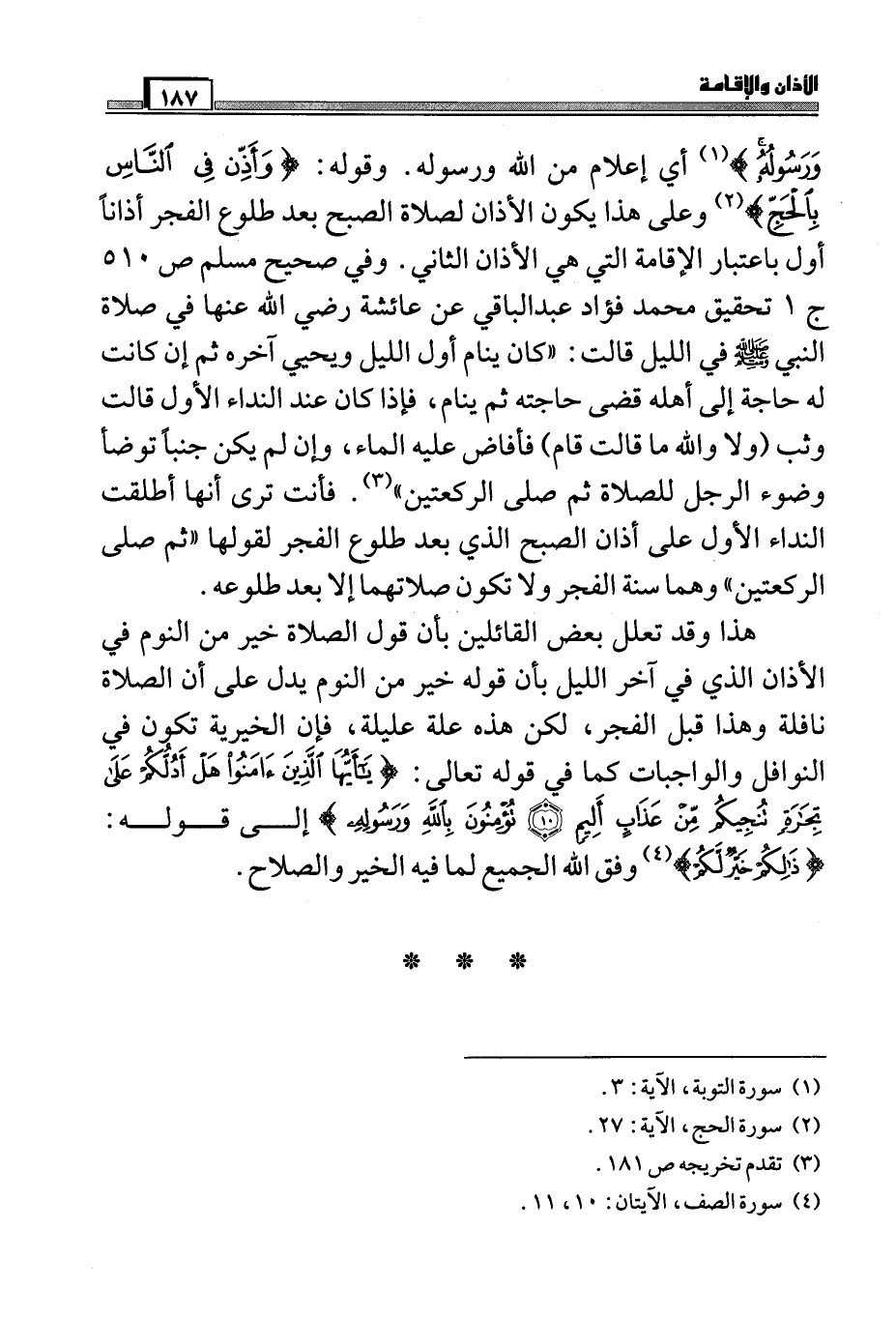 وَرَسُولُهُ) (¬1) ، أي إعلام من الله ورسوله. وقوله: (وَأَذِّنْ فِي النَّاسِ بِالْحَجِّ) (¬2) ، وعلى هذا يكون الأذان لصلاة الصبح بعد طلوع الفجر أذاناً أول باعتبار الإقامة التي هي الأذان الثاني. وفي صحيح مسلم ص510 ج1 تحقيق محمد فؤاد عبد الباقي عن عائشة رضي الله عنها في صلاة النبي صَلَّى اللَّهُ عَلَيْهِ وَسَلَّمَ في الليل قالت: " كان ينام أول الليل ويحيي آخره ثم إن كانت له حاجة إلى أهله قضى حاجته ثم ينام، فإذا كان عند النداء الأول قالت وثب (ولا والله ما قالت قام) فأفاض عليه الماء، وإن لم يكن جنباً توضأ وضوء الرجل للصلاة ثم صلى الركعتين " (¬3) . فأنت ترى أنها أطلقت النداء الأول على أذان الصبح الذي بعد طلوع الفجر لقولها " ثم صلى الركعتين " وهما سنة الفجر ولا تكون صلاتهما إلا بعد طلوعه.