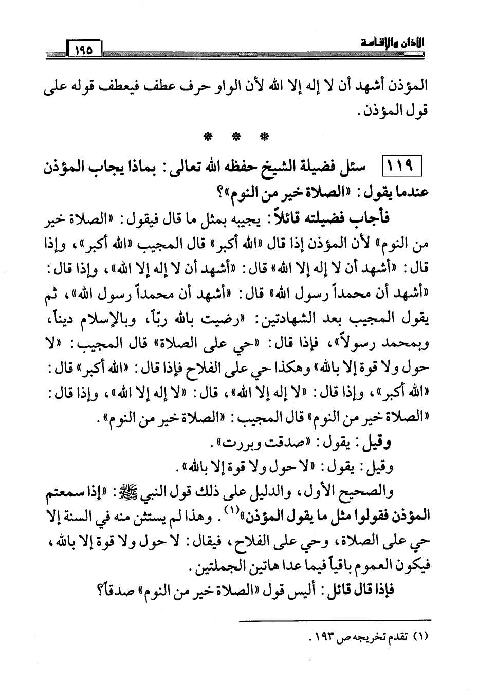 119) سئل فضيلة الشيخ حفظه الله تعالى: بماذا يجاب المؤذن عندما يقول: "الصلاة خير من النوم "؟