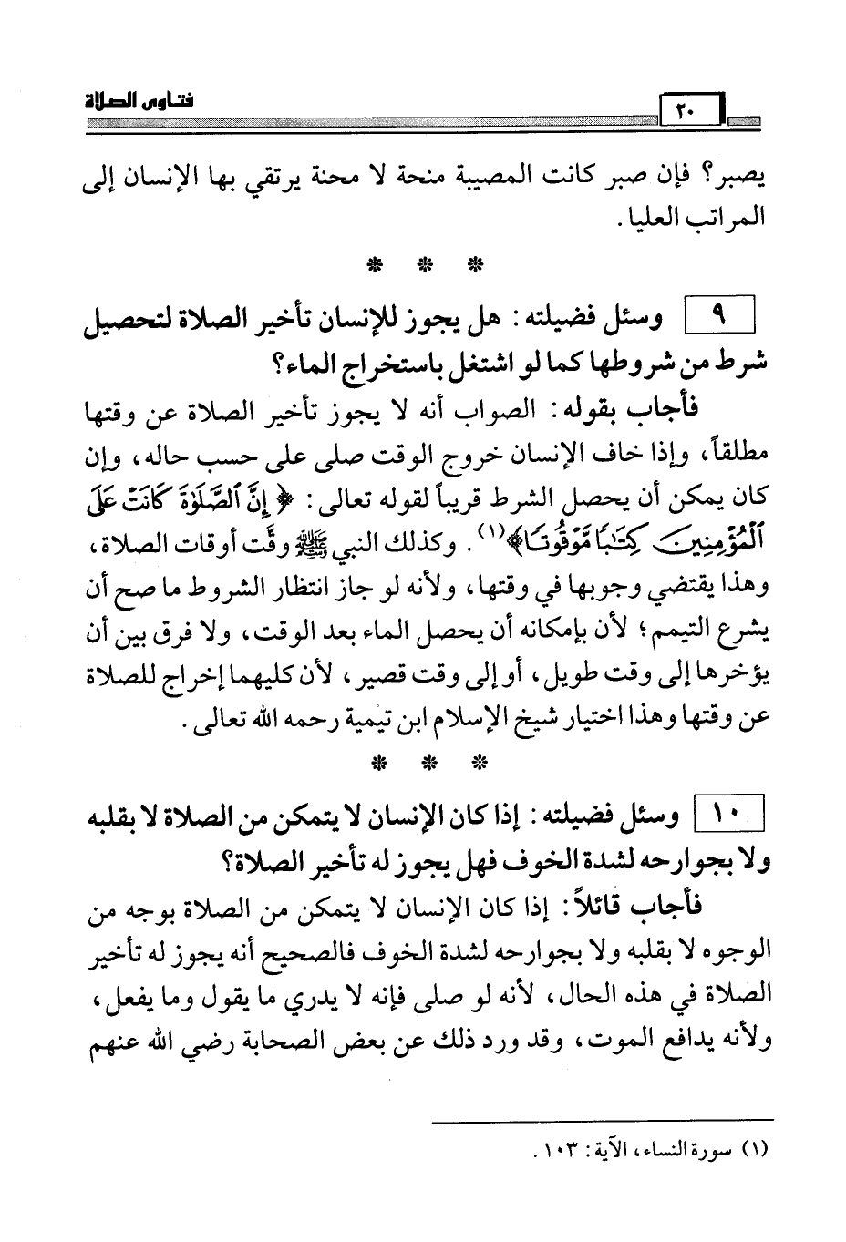 9) وسئل فضيلته: هل يجوز للإنسان تأخير الصلاة لتحصيل شرط من شروطها كما لو اشتغل باستخراج الماء؟