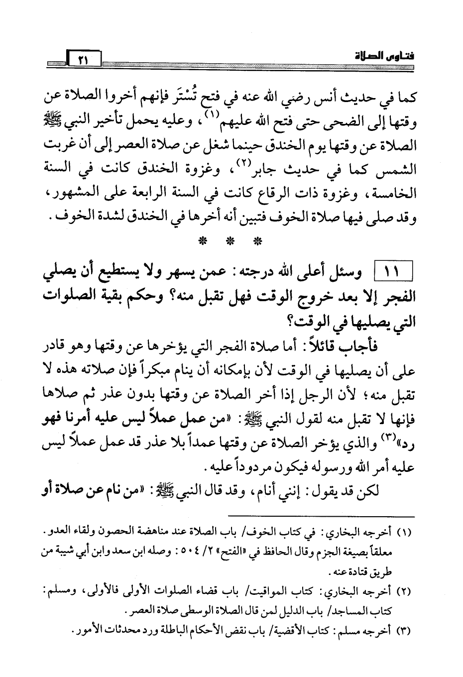 فأجاب قائلاً: أما صلاة الفجر التي يؤخرها عن وقتها وهو قادر على أن يصليها في الوقت لأن بإمكانه أن ينام مبكراً فإن صلاته هذه لا تقبل منه لقول النبي صَلَّى اللَّهُ عَلَيْهِ وَسَلَّمَ: " من عمل عملاً ليس عليه أمرنا فهو رد " (¬3) والذي يؤخر الصلاة عن وقتها عمداً بلا عذر قد عمل عملاً ليس عليه أمر الله ورسوله فيكون مردوداً عليه.
