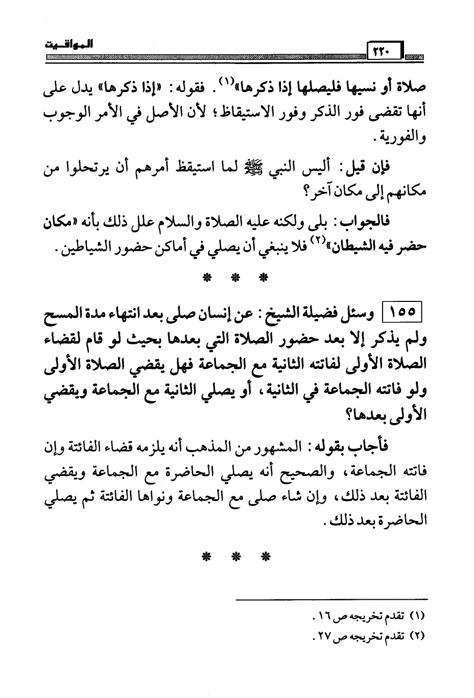 155) وسئل فضيلة الشيخ: عن إنسان صلى بعد انتهاء مدة المسح ولم يذكر إلا بعد حضور الصلاة التي بعدها بحيث لو قام لقضاء الصلاة الأولى لفاتته الثانية مع الجماعة فهل يقضي الصلاة الأولى ولو فاتته الجماعة في الثانية، أو يصلي الثانية مع الجماعة ويقضي الأولى بعدها؟